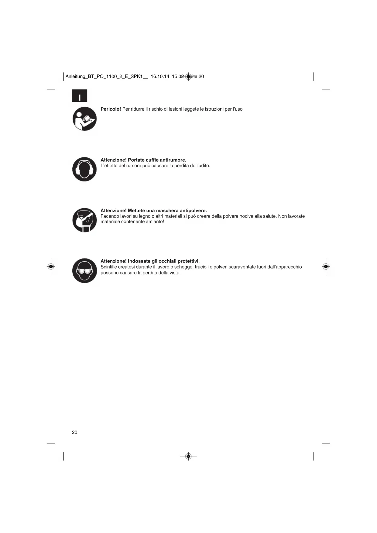 Pericolo! Per ridurre il rischio di lesioni leggete le istruzioni per l’uso Attenzione! Portate cuffie antirumore. L’effetto del rumore può causare la perdita dell’udito. Attenzione! Mettete una maschera antipolvere. Facendo lavori su legno o altri materiali si può creare della polvere nociva alla salute. Non lavorate materiale contenente amianto! Attenzione! Indossate gli occhiali protettivi. Scintille createsi durante il lavoro o schegge, trucioli e polveri scaraventate fuori dall’apparecchio possono causare la perdita della vista. Anleitung_BT_PO_1100_2_E_SPK1__ 16.10.14 15:02 Seite 20Pericolo! Nellʼusare gli apparecchi si devono rispettare diverse avvertenze di sicurezza per evitare lesioni e danni. Quindi leggete attentamente queste istruzioni per lʼuso. Conservatele bene per avere a disposizione le informazioni in qualsiasi momento. Se date lʼapparecchio ad altre persone consegnate loro queste istruzioni per lʼuso insieme allʼapparecchio! Non ci assumiamo alcuna responsabilità per incidenti o danni causati dal mancato rispetto di queste istruzioni e delle avvertenze di sicurezza.