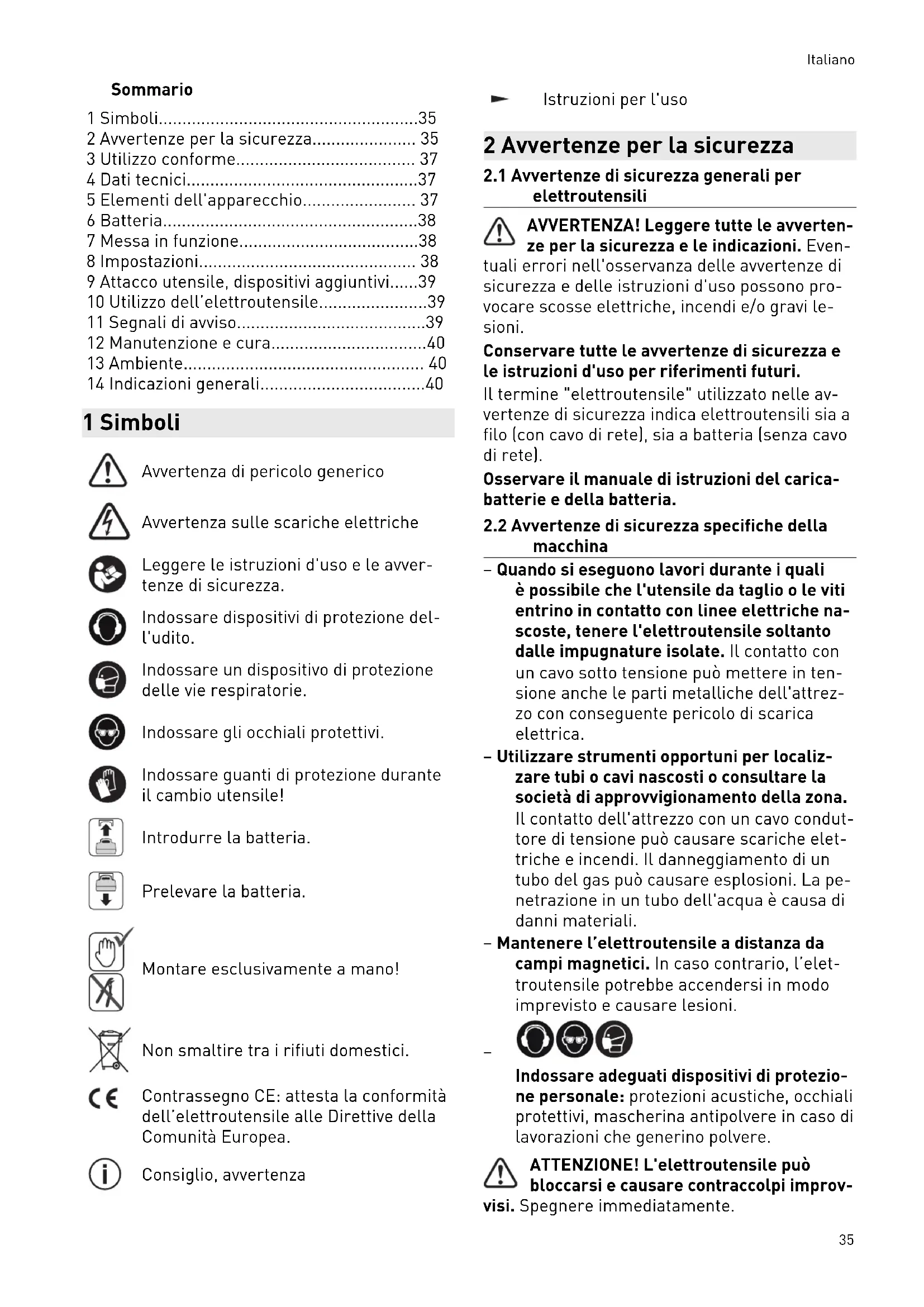 - 14 Indicazioni generali 1 Simboli Avvertenza di pericolo generico Avvertenza sulle scariche elettriche Leggere le istruzioni d'uso e le avver tenze di sicurezza. Indossare dispositivi di protezione del l'udito. Indossare un dispositivo di protezione delle vie respiratorie. Indossare gli occhiali protettivi. Indossare guanti di protezione durante il cambio utensile! Introdurre la batteria. Prelevare la batteria. Montare esclusivamente a mano! Non smaltire tra i rifiuti domestici. Contrassegno CE: attesta la conformità dell’elettroutensile alle Direttive della Comunità Europea. Consiglio, avvertenza Istruzioni per l'uso 2 Avvertenze per la sicurezza p. 40
