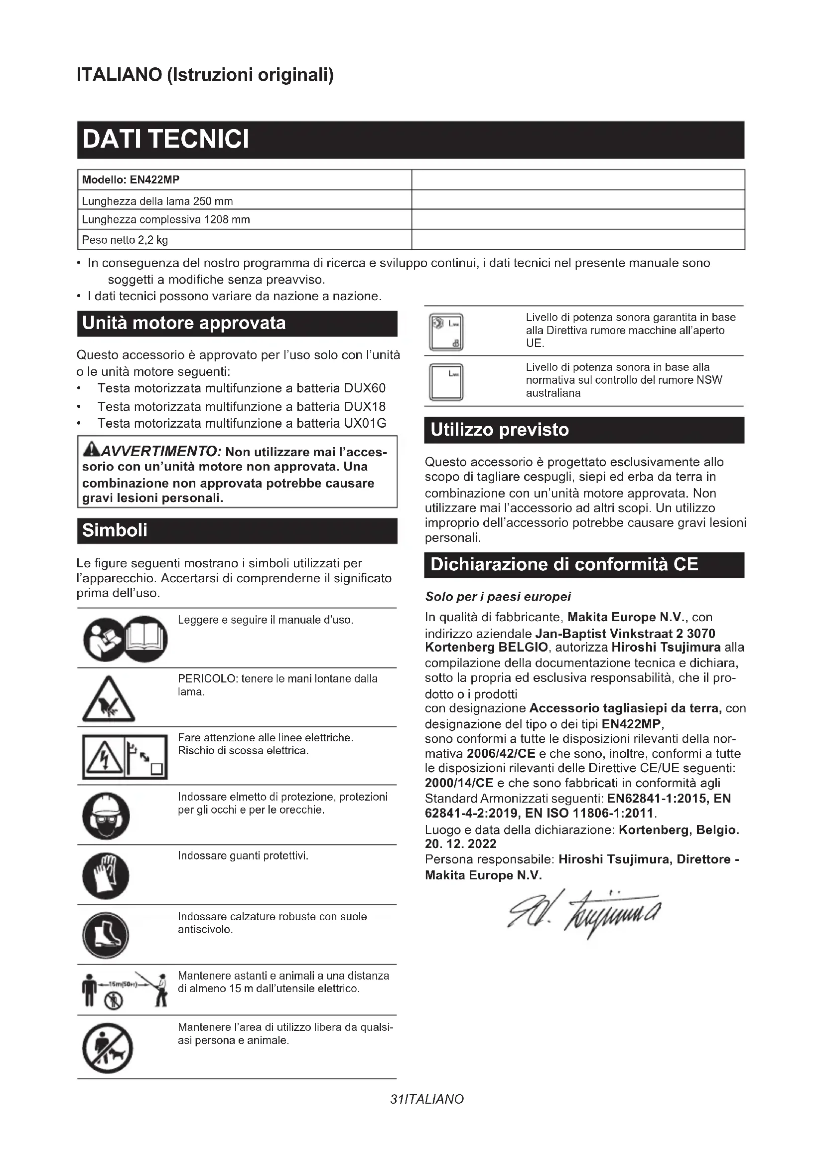 - TestamotorizzatamultifunzioneabatteriaUX01G AVVERTIMENTO: Non utilizzare mai l’acces- sorio con un’unità motore non approvata. Una combinazione non approvata potrebbe causare gravi lesioni personali. Simboli Legureseguentimostranoisimboliutilizzatiper l’apparecchio.Accertarsidicomprenderneilsignicato prima dell’uso. Leggere e seguire il manuale d’uso. PERICOLO: tenere le mani lontane dalla lama. Fare attenzione alle linee elettriche. Rischio di scossa elettrica. Indossare elmetto di protezione, protezioni per gli occhi e per le orecchie. Indossare guanti protettivi. Indossarecalzaturerobusteconsuole antiscivolo. Mantenere astanti e animali a una distanza di almeno 15 m dall’utensile elettrico. Mantenerel’areadiutilizzoliberadaqualsi- asi persona e animale. Livellodipotenzasonoragarantitainbase alla Direttiva rumore macchine all’aperto UE. Livellodipotenzasonorainbasealla normativa sul controllo del rumore NSW australiana Utilizzo previsto Questoaccessorioèprogettatoesclusivamenteallo scopoditagliarecespugli,siepiederbadaterrain combinazioneconun’unitàmotoreapprovata.Non utilizzare mai l’accessorio ad altri scopi. Un utilizzo impropriodell’accessoriopotrebbecausaregravilesioni personali. Dichiarazione di conformità CE Solo per i paesi europei Inqualitàdifabbricante,Makita Europe N.V., con indirizzo aziendale Jan-Baptist Vinkstraat 2 3070 Kortenberg BELGIO, autorizza Hiroshi Tsujimura alla compilazione della documentazione tecnica e dichiara, sottolapropriaedesclusivaresponsabilità,cheilpro- dotto o i prodotti con designazione Accessorio tagliasiepi da terra, con designazione del tipo o dei tipi EN422MP, sono conformi a tutte le disposizioni rilevanti della nor- mativa 2006/42/CE e che sono, inoltre, conformi a tutte le disposizioni rilevanti delle Direttive CE/UE seguenti: 2000/14/CEechesonofabbricatiinconformitàagli Standard Armonizzati seguenti: EN62841-1:2015, EN 62841-4-2:2019, EN ISO 11806-1:2011. Luogo e data della dichiarazione: Kortenberg, Belgio.