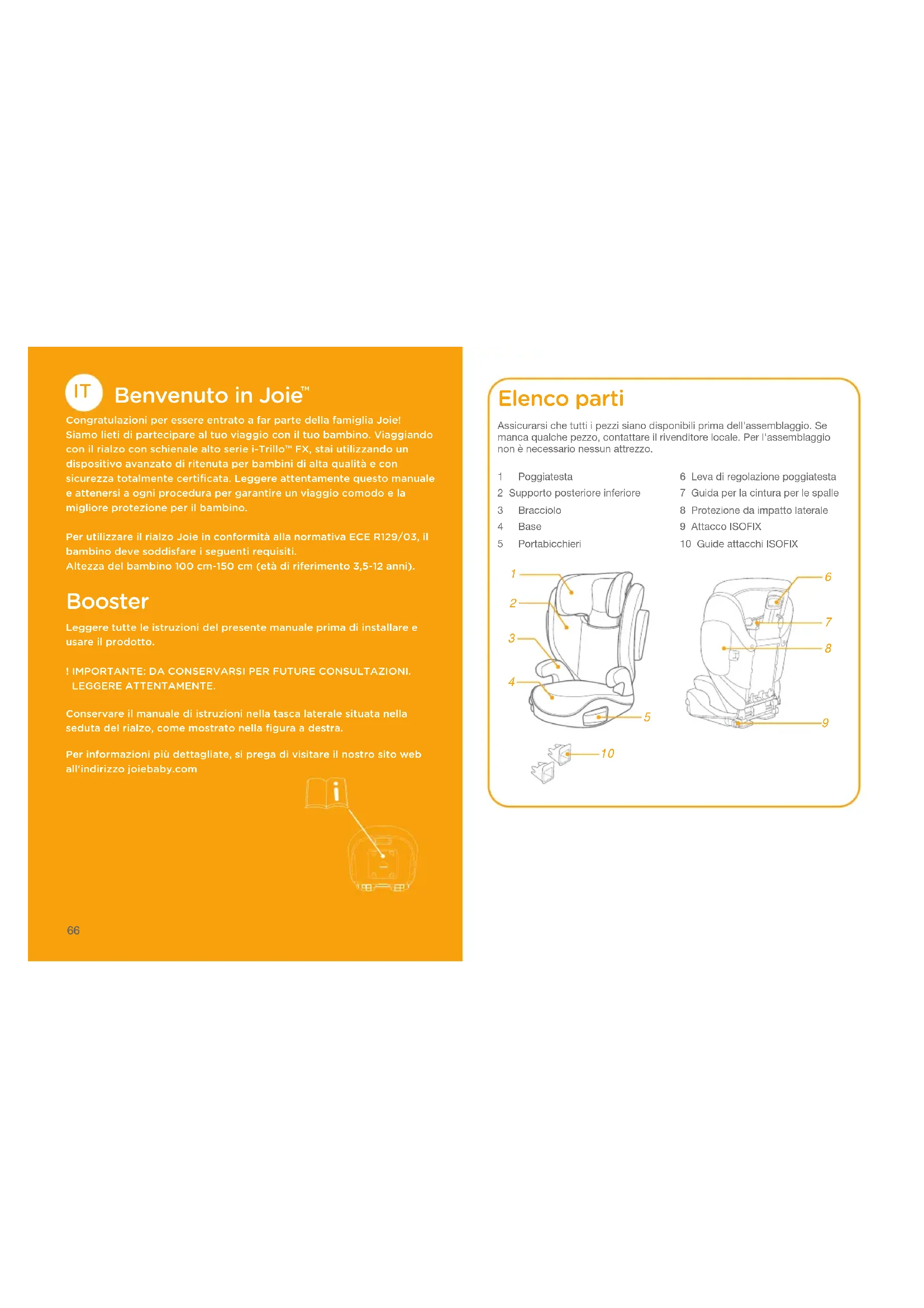 Congratulazioni per essere entrato a far parte della famiglia Joie! Siamo lieti di partecipare al tuo viaggio con il tuo bambino. Viaggiando con il rialzo con schienale alto serie i-Trillo™ FX, stai utilizzando un dispositivo avanzato di ritenuta per bambini di alta qualità e con sicurezza totalmente certificata. Leggere attentamente questo manuale e attenersi a ogni procedura per garantire un viaggio comodo e la migliore protezione per il bambino.Per utilizzare il rialzo Joie in conformità alla normativa ECE R129/03, il bambino deve soddisfare i seguenti requisiti.Altezza del bambino 100 cm-150 cm (età di riferimento 3,5-12 anni). Booster Leggere tutte le istruzioni del presente manuale prima di installare e usare il prodotto.! IMPORTANTE: DA CONSERVARSI PER FUTURE CONSULTAZIONI. LEGGERE ATTENTAMENTE.Conservare il manuale di istruzioni nella tasca laterale situata nella seduta del rialzo, come mostrato nella figura a destra.Per informazioni più dettagliate, si prega di visitare il nostro sito web all'indirizzo joiebaby.com