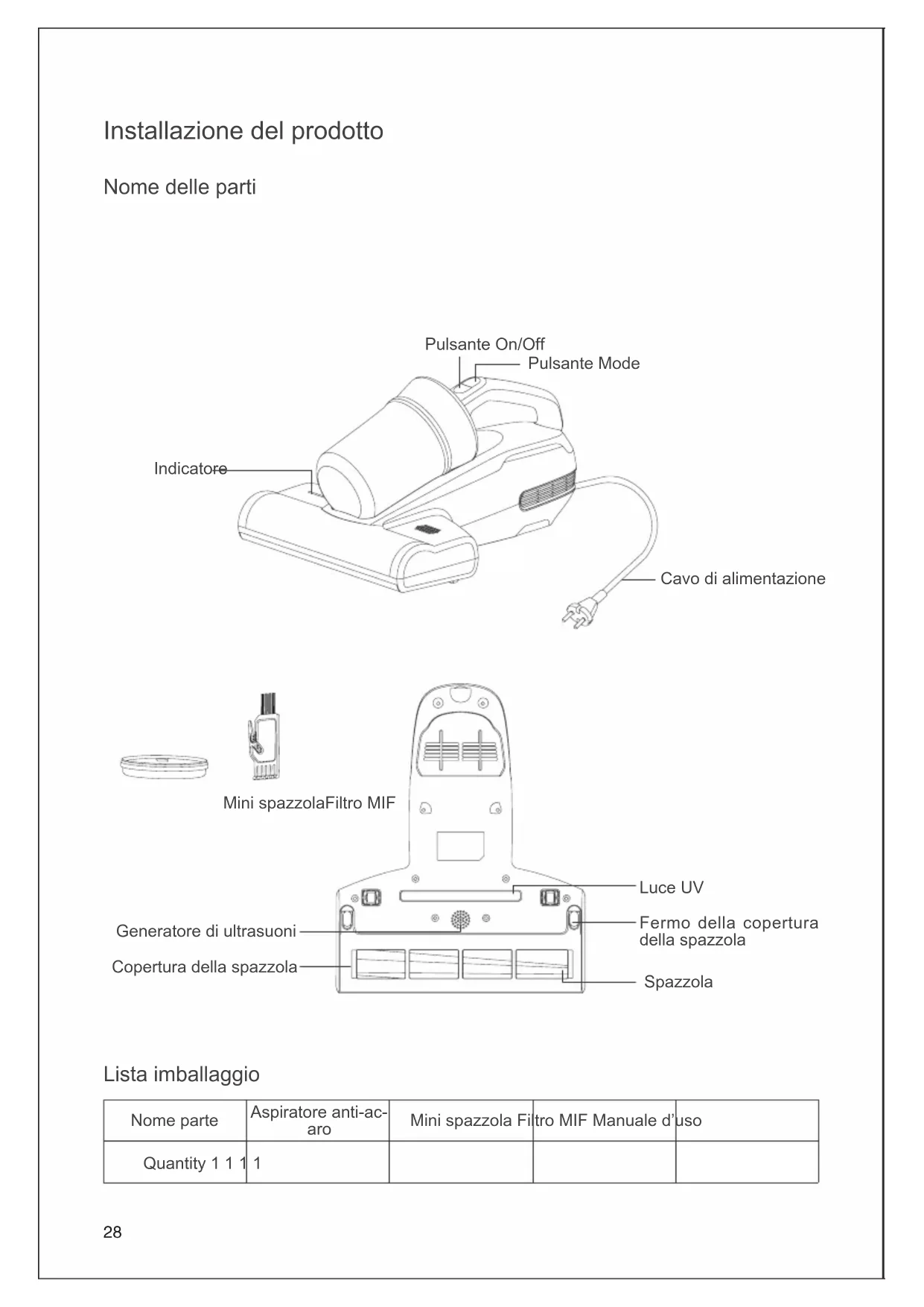 PCB principale Alimentatore PCB PCB luce UV Microswitch sinistro Microswitch destro Motore aspirazione 220-240V~ 50-60Hz Motore spazzola Attivatore onde a ultrasuoni Pulsante On/Off Speciche del prodotto Parametri tecnici Modello BX5 Pro Voltaggio nominale 220-240V~ Frequenza nominale 50-60Hz Potenza nominale 500W34 Informazioni sul produttore Produttore Kingclean Electric Co., Ltd Indirizzo No.1 Xiangyang Road, Suzhou New District, Jiangsu Province 215009,China Disposizioni La macchina, gli accessori e l'imballaggio devono essere smaltiti seguendo le regole per il riciclaggio ecologico. Non smaltire la macchina nei rifiuti domestici! Solo per i paesi CE: Secondo la Direttiva Europea 2012/19/EU, le macchine non più utilizzabili, e secondo la Direttiva Europea 2006/66/EC, i pacchi batteria/batterie difettosi o usati, devono essere raccolti separatamente e smaltiti in modo corretto per l'ambiente. Soggetto a modica senza preavviso. Informazioni sulla garanzia Questo prodotto gode di un anno di garanzia a partire dalla data di acquisto. Sono esclusi dalla garanzia la normale usura, l'uso commerciale, le alterazioni dell'apparecchio acquistato, le attività di pulizia, le conseguenze di un utilizzo improprio o danni da parte dell'acquirente o di una terza persona, danni che possono essere attribuiti a circostanze esterne.35 Lista de empaque Montaje del producto Nombre de las piezas Nombre Aspirador Filtro MIF Mini cepillo Instrucciones de uso Quantity 1 1 1 1 Boton de encendido / apagado Luz indicadora Generador ultrasónico Luz LED UV Rodillo de cepillo Tapa del rodillo de cepillado Botón de modo Cable d’alimentación Mini cepilloFiltro MIF Picaporte de la tapa del rodillo de cepillado36