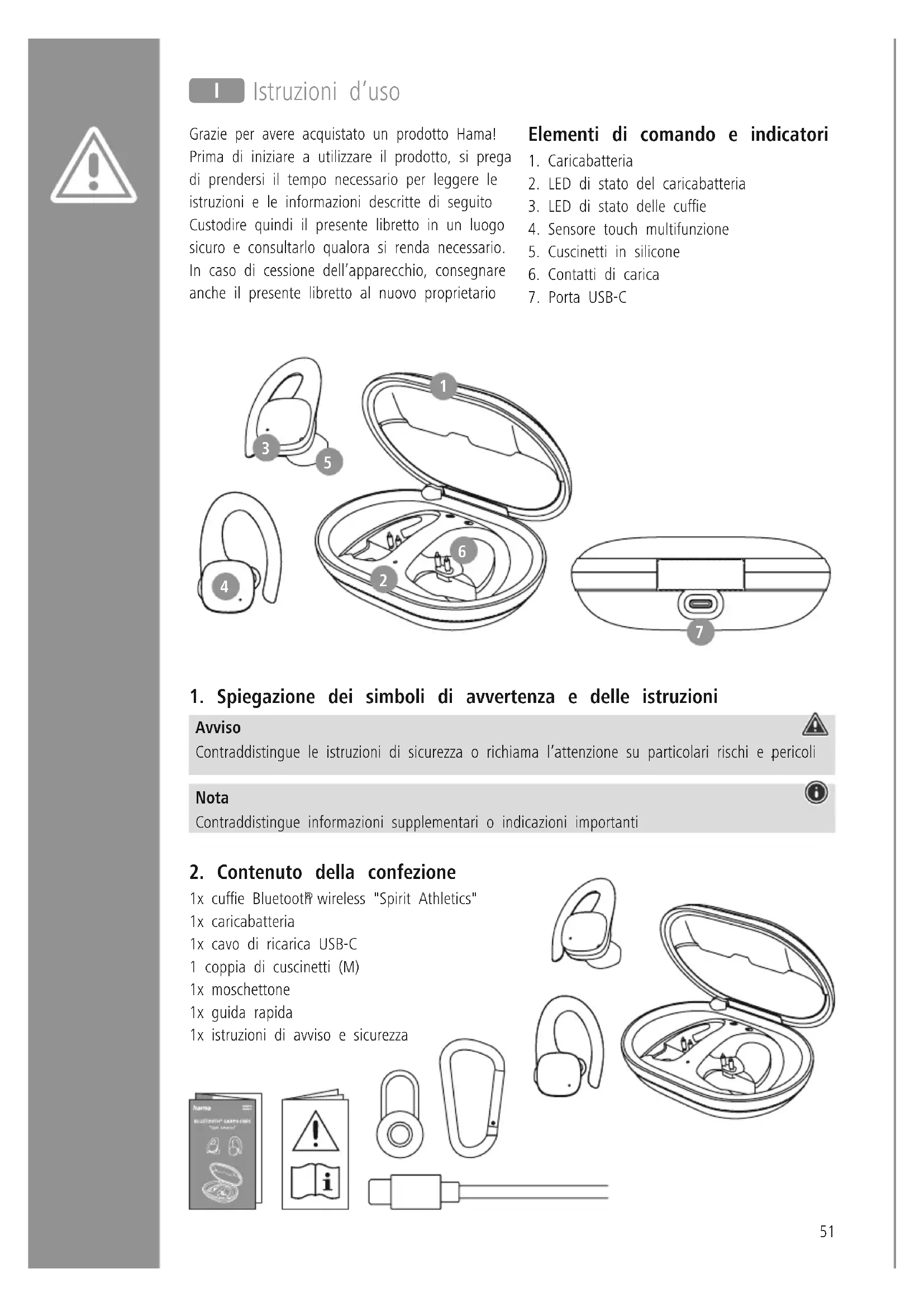 wireless "Spirit Athletics" 1x caricabatteria 1x cavo di ricarica USB-C 1 coppia di cuscinetti (M) 1x moschettone 1x guida rapida 1x istruzioni di avviso e sicurezza I Istruzioni d’uso