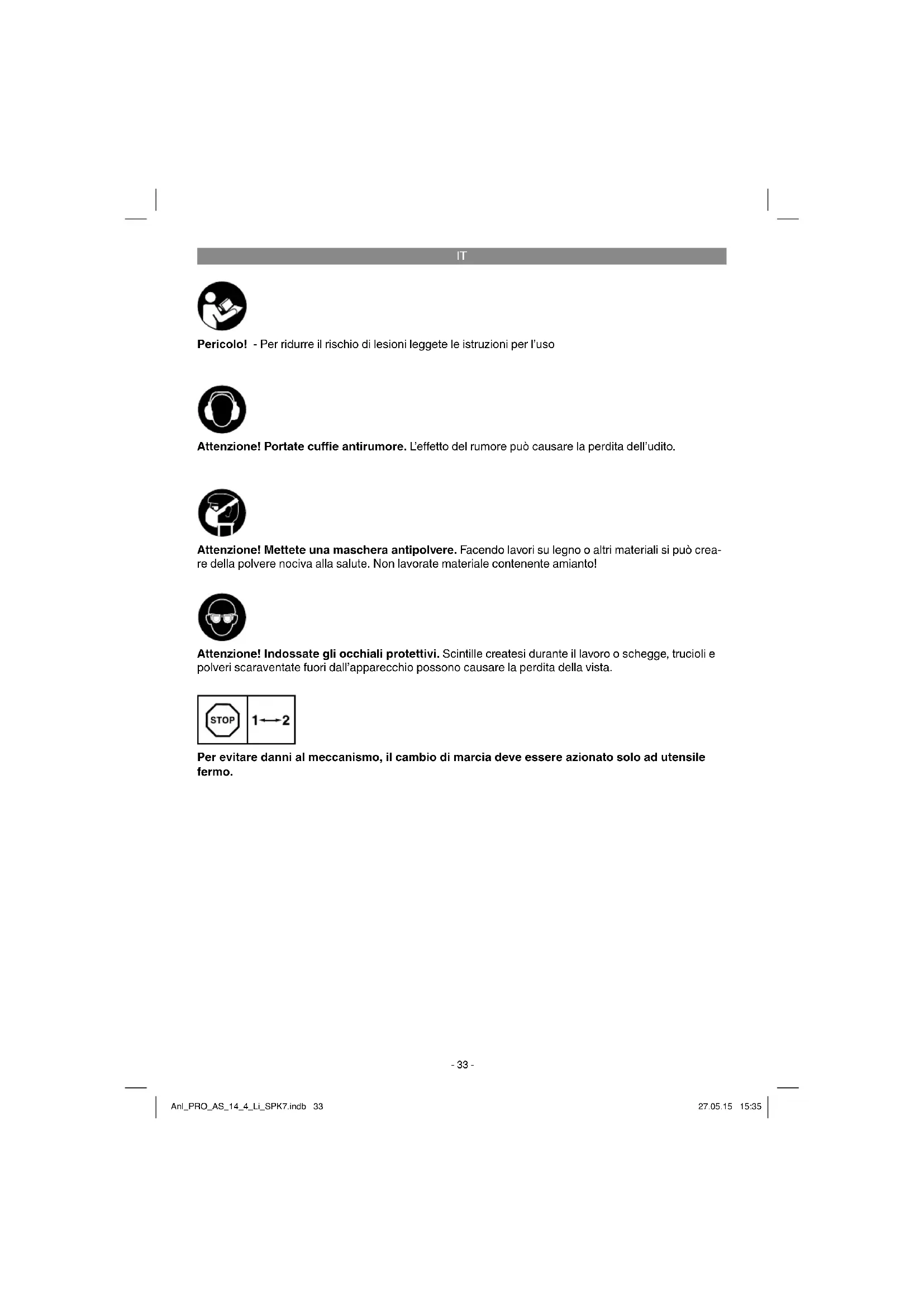 Pericolo! - Per ridurre il rischio di lesioni leggete le istruzioni per l’uso Attenzione! Portate cuffi e antirumore. L’e ff etto del rumore può causare la perdita dell’udito. Attenzione! Indossate gli occhiali protettivi. Scintille createsi durante il lavoro o schegge, trucioli e polveri scaraventate fuori dall’apparecchio possono causare la perdita della vista. Attenzione! Mettete una maschera antipolvere. Facendo lavori su legno o altri materiali si può crea- re della polvere nociva alla salute. Non lavorate materiale contenente amianto! Per evitare danni al meccanismo, il cambio di marcia deve essere azionato solo ad utensile fermo. Anl_PRO_AS_14_4_Li_SPK7.indb 33Anl_PRO_AS_14_4_Li_SPK7.indb 33 27.05.15 15:3527.05.15 15:35IT