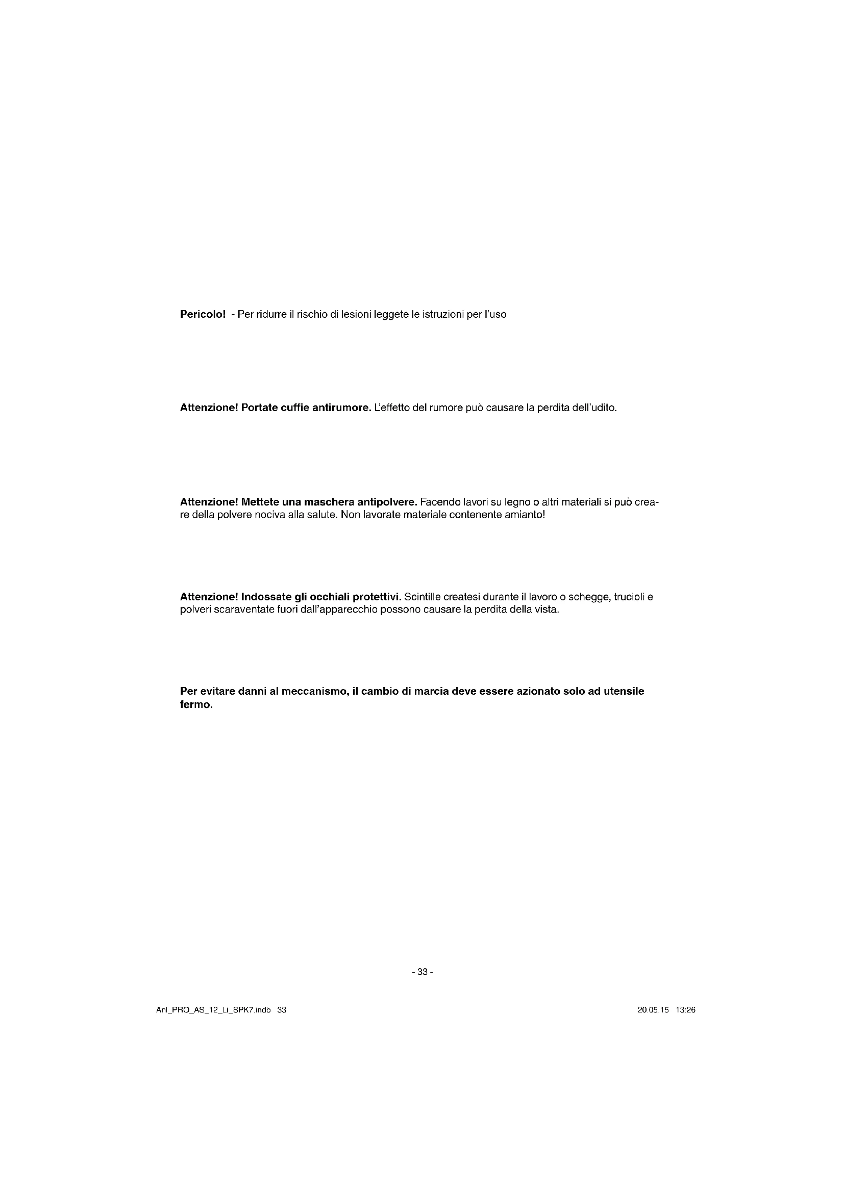 Pericolo! - Per ridurre il rischio di lesioni leggete le istruzioni per l’uso Attenzione! Portate cuffi e antirumore. L’e ff etto del rumore può causare la perdita dell’udito. Attenzione! Indossate gli occhiali protettivi. Scintille createsi durante il lavoro o schegge, trucioli e polveri scaraventate fuori dall’apparecchio possono causare la perdita della vista. Attenzione! Mettete una maschera antipolvere. Facendo lavori su legno o altri materiali si può crea- re della polvere nociva alla salute. Non lavorate materiale contenente amianto! Per evitare danni al meccanismo, il cambio di marcia deve essere azionato solo ad utensile fermo. Anl_PRO_AS_12_Li_SPK7.indb 33Anl_PRO_AS_12_Li_SPK7.indb 33 20.05.15 13:2620.05.15 13:26IT
