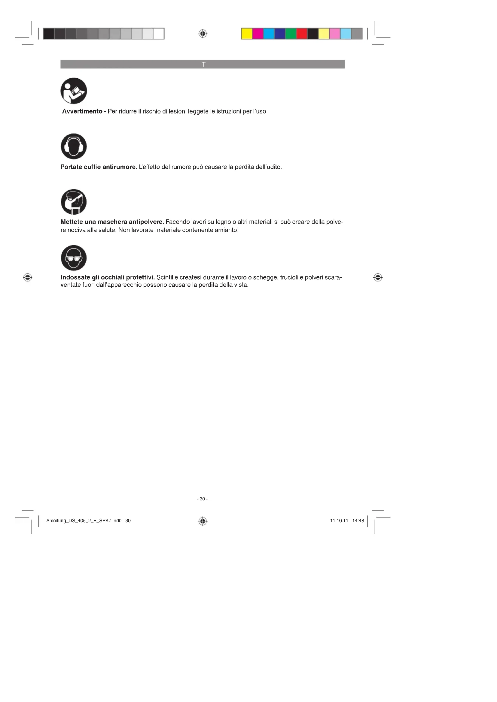 Avvertimento - Per ridurre il rischio di lesioni leggete le istruzioni per l’uso Portate cuffi e antirumore. L’e ff etto del rumore può causare la perdita dell’udito. Indossate gli occhiali protettivi. Scintille createsi durante il lavoro o schegge, trucioli e polveri scara- ventate fuori dall’apparecchio possono causare la perdita della vista. Mettete una maschera antipolvere. Facendo lavori su legno o altri materiali si può creare della polve- re nociva alla salute. Non lavorate materiale contenente amianto! Anleitung_DS_405_2_E_SPK7.indb 30Anleitung_DS_405_2_E_SPK7.indb 30 11.10.11 14:4811.10.11 14:48IT