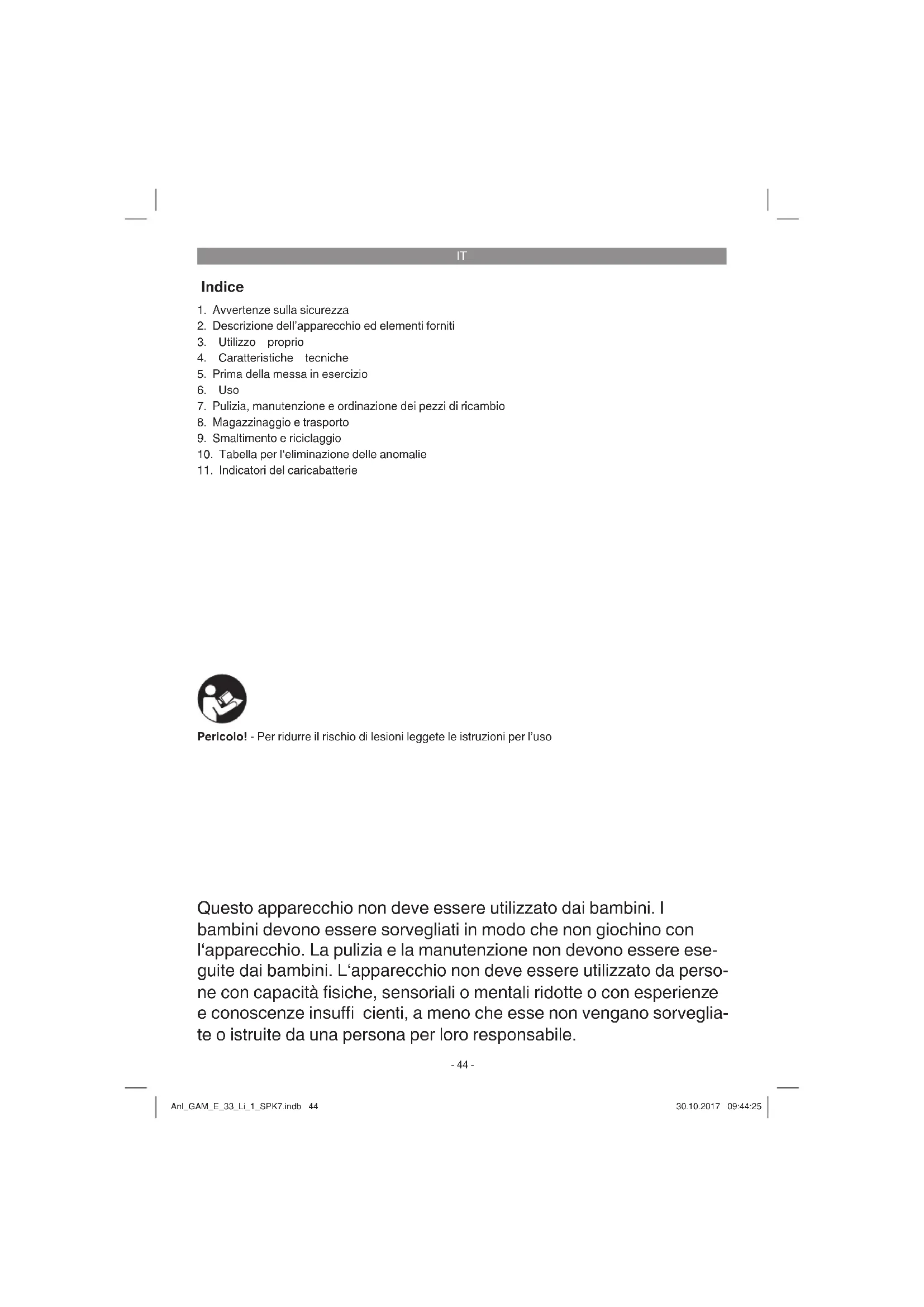 Questo apparecchio non deve essere utilizzato dai bambini. I bambini devono essere sorvegliati in modo che non giochino con l‘apparecchio. La pulizia e la manutenzione non devono essere ese- guite dai bambini. L‘apparecchio non deve essere utilizzato da perso- ne con capacità fi siche, sensoriali o mentali ridotte o con esperienze e conoscenze insuffi cienti, a meno che esse non vengano sorveglia- te o istruite da una persona per loro responsabile. Pericolo! - Per ridurre il rischio di lesioni leggete le istruzioni per l’uso Anl_GAM_E_33_Li_1_SPK7.indb 44Anl_GAM_E_33_Li_1_SPK7.indb 44 30.10.2017 09:44:2530.10.2017 09:44:25IT