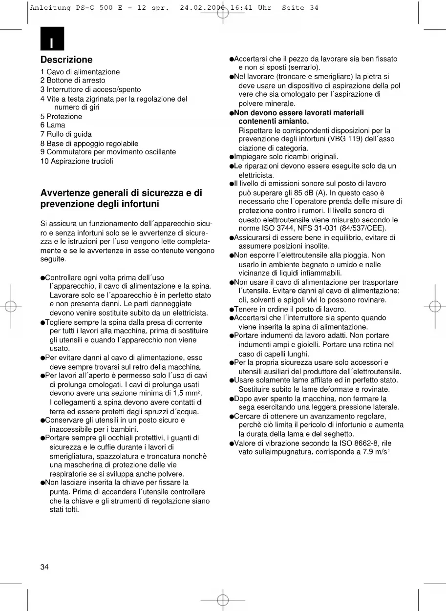 P‡ıÌÈÛË ÂÎÎÚÂÌÔ‡˜ ÂÌ‚ÔÏÈÛÌÔ‡ £¤ÛË 0 ÂÌ‚ÔÏÈÛÌfi˜ Ìˉ¤Ó £¤ÛË 1 ÂÏ·ÊÚfi˜ ÂÌ‚ÔÏÈÛÌfi˜ £¤ÛË 2 ̤ÙÚÈÔ˜ ÂÌ‚ÔÏÈÛÌfi˜ Anleitung PS-G 500 E - 12 spr. 24.02.2000 16:41 Uhr Seite 3334 Descrizione 1 Cavo di alimentazione 2 Bottone di arresto 3 Interruttore di acceso/spento 4 Vite a testa zigrinata per la regolazione del numero di giri 5 Protezione 6 Lama 7 Rullo di guida 8 Base di appoggio regolabile 9 Commutatore per movimento oscillante 10 Aspirazione trucioli Avvertenze generali di sicurezza e di prevenzione degli infortuni Si assicura un funzionamento dell´apparecchio sicu- ro e senza infortuni solo se le avvertenze di sicure- zza e le istruzioni per l´uso vengono lette completa- mente e se le avvertenze in esse contenute vengono seguite. Controllare ogni volta prima dell´uso l´apparecchio, il cavo di alimentazione e la spina. Lavorare solo se l´apparecchio è in perfetto stato e non presenta danni. Le parti danneggiate devono venire sostituite subito da un elettricista. Togliere sempre la spina dalla presa di corrente per tutti i lavori alla macchina, prima di sostituire gli utensili e quando l´apparecchio non viene usato. Per evitare danni al cavo di alimentazione, esso deve sempre trovarsi sul retro della macchina. Per lavori all´aperto è permesso solo l´uso di cavi di prolunga omologati. I cavi di prolunga usati devono avere una sezione minima di 1,5 mm
