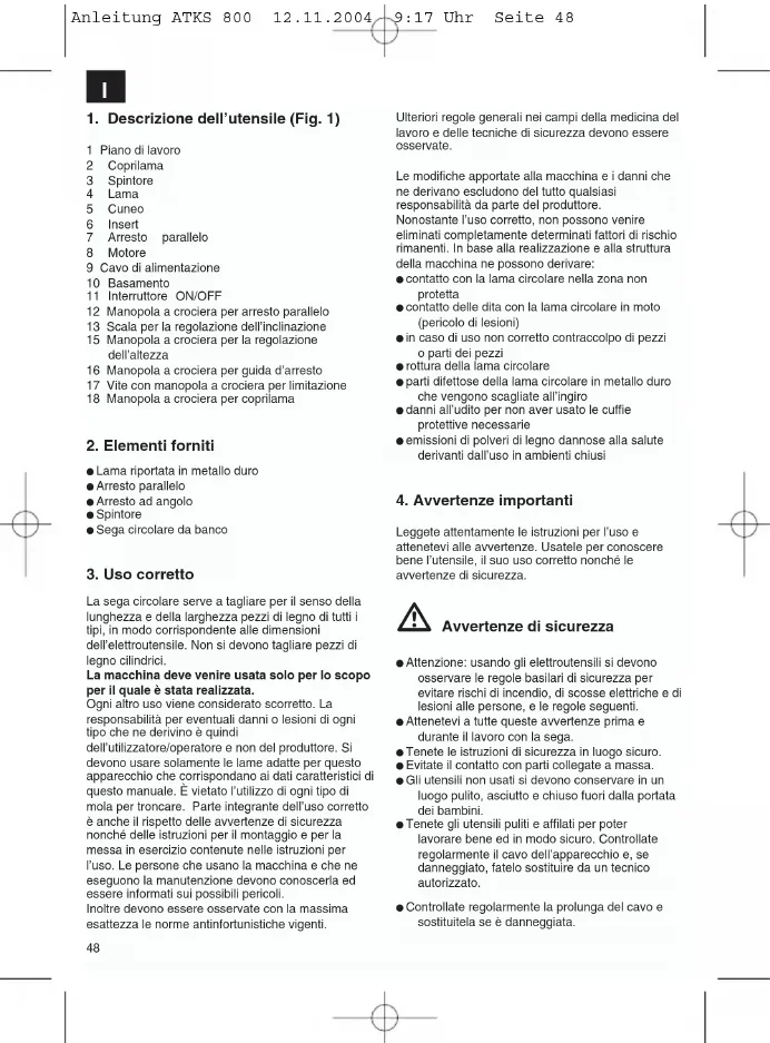 Leggete attentamente le istruzioni per l’uso e attenetevi alle avvertenze. Usatele per conoscere bene l’utensile, il suo uso corretto nonché le avvertenze di sicurezza. Avvertenze di sicurezza Attenzione: usando gli elettroutensili si devono osservare le regole basilari di sicurezza per evitare rischi di incendio, di scosse elettriche e di lesioni alle persone, e le regole seguenti. Attenetevi a tutte queste avvertenze prima e durante il lavoro con la sega. Tenete le istruzioni di sicurezza in luogo sicuro. Evitate il contatto con parti collegate a massa. Gli utensili non usati si devono conservare in un luogo pulito, asciutto e chiuso fuori dalla portata dei bambini. Tenete gli utensili puliti e affilati per poter lavorare bene ed in modo sicuro. Controllate regolarmente il cavo dell’apparecchio e, se danneggiato, fatelo sostituire da un tecnico autorizzato. Controllate regolarmente la prolunga del cavo e sostituitela se è danneggiata. Anleitung ATKS 800 12.11.2004 9:17 Uhr Seite 48I