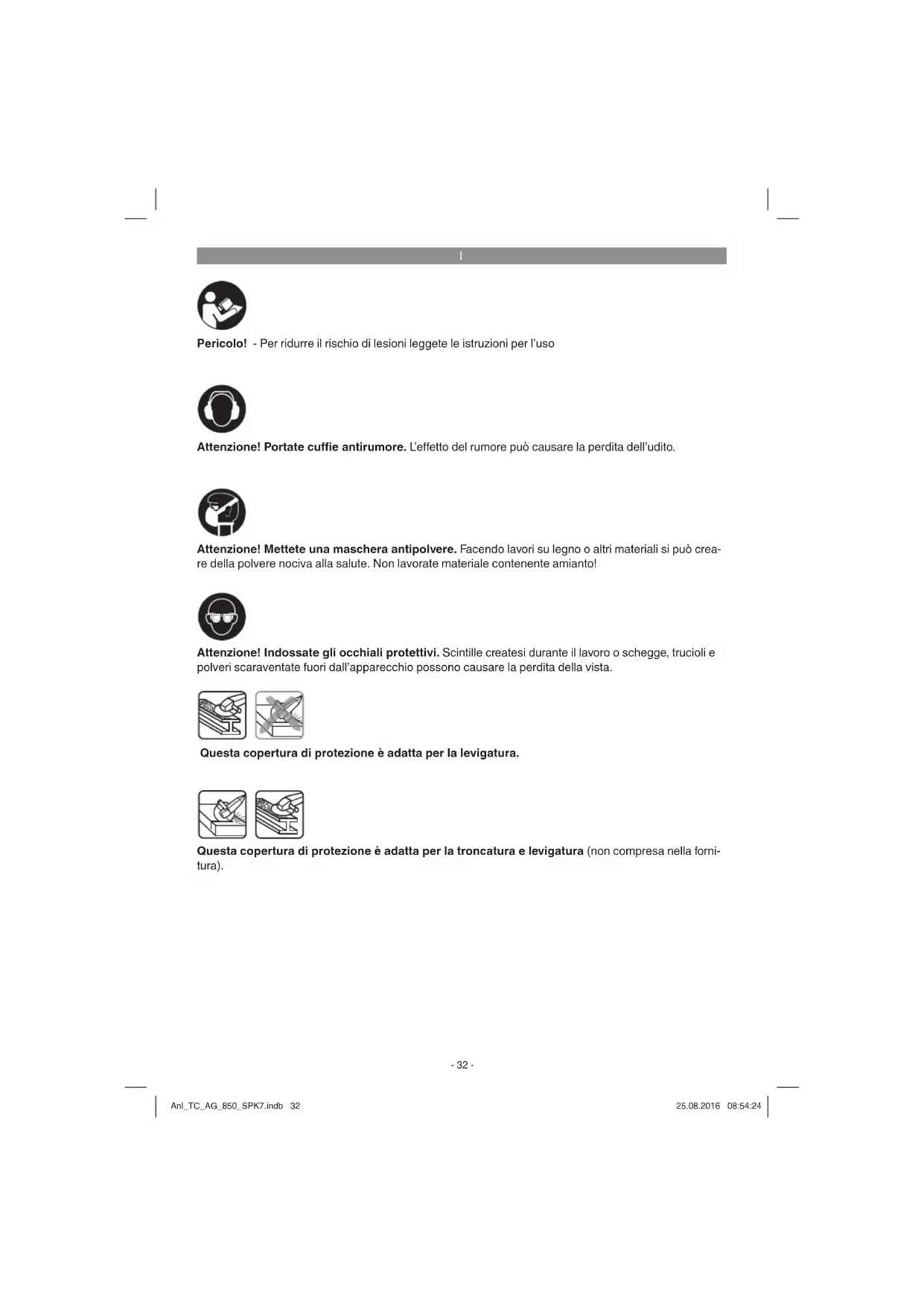 Pericolo! - Per ridurre il rischio di lesioni leggete le istruzioni per l’uso Attenzione! Portate cuffi e antirumore. L’e ff etto del rumore può causare la perdita dell’udito. Attenzione! Indossate gli occhiali protettivi. Scintille createsi durante il lavoro o schegge, trucioli e polveri scaraventate fuori dall’apparecchio possono causare la perdita della vista. Attenzione! Mettete una maschera antipolvere. Facendo lavori su legno o altri materiali si può crea- re della polvere nociva alla salute. Non lavorate materiale contenente amianto! Questa copertura di protezione è adatta per la troncatura e levigatura (non compresa nella forni- tura). Questa copertura di protezione è adatta per la levigatura. Anl_TC_AG_850_SPK7.indb 32Anl_TC_AG_850_SPK7.indb 32 25.08.2016 08:54:2425.08.2016 08:54:24I