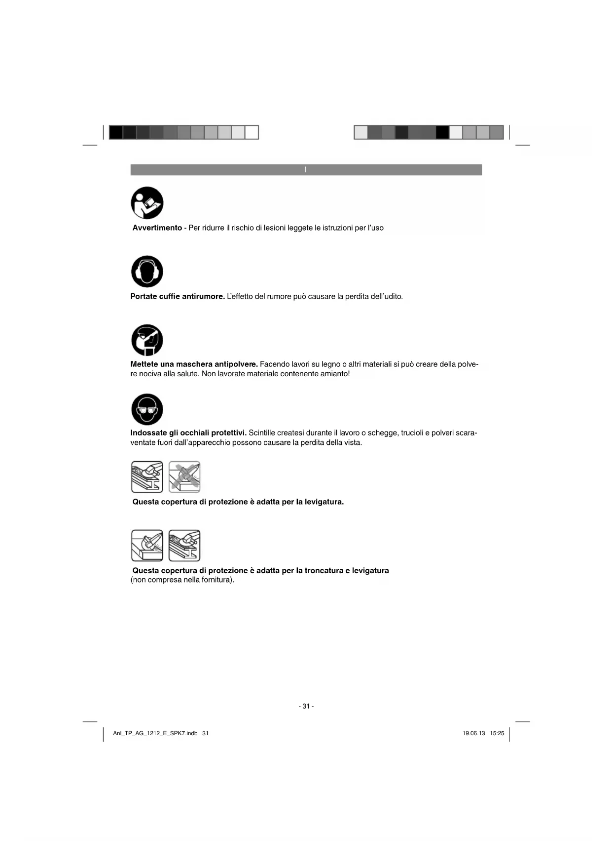 Avvertimento - Per ridurre il rischio di lesioni leggete le istruzioni per l’uso Portate cuffi e antirumore. L’e ff etto del rumore può causare la perdita dell’udito. Indossate gli occhiali protettivi. Scintille createsi durante il lavoro o schegge, trucioli e polveri scara- ventate fuori dall’apparecchio possono causare la perdita della vista. Mettete una maschera antipolvere. Facendo lavori su legno o altri materiali si può creare della polve- re nociva alla salute. Non lavorate materiale contenente amianto! Questa copertura di protezione è adatta per la troncatura e levigatura (non compresa nella fornitura). Questa copertura di protezione è adatta per la levigatura. Anl_TP_AG_1212_E_SPK7.indb 31Anl_TP_AG_1212_E_SPK7.indb 31 19.06.13 15:2519.06.13 15:25I