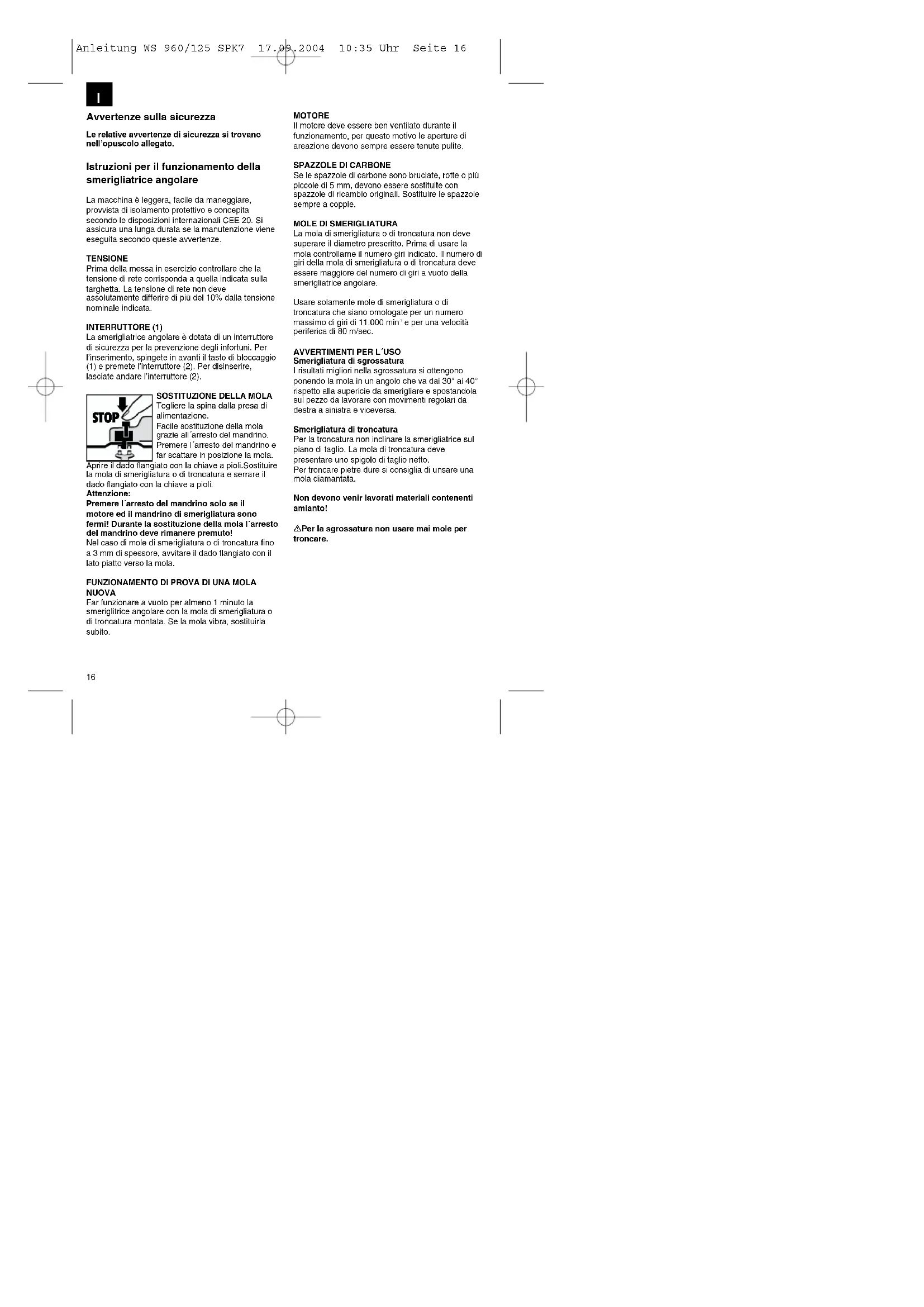 Brida de tensado Tuerca bridada Disposición de las bridas si se emplea un disco de corte recto. Anleitung WS 960/125 SPK7 17.09.2004 10:35 Uhr Seite 15Avvertenze sulla sicurezza Le relative avvertenze di sicurezza si trovano nell’opuscolo allegato. Istruzioni per il funzionamento della smerigliatrice angolare La macchina è leggera, facile da maneggiare, provvista di isolamento protettivo e concepita secondo le disposizioni internazionali CEE 20. Si assicura una lunga durata se la manutenzione viene eseguita secondo queste avvertenze. TENSIONE Prima della messa in esercizio controllare che la tensione di rete corrisponda a quella indicata sulla targhetta. La tensione di rete non deve assolutamente differire di più del 10% dalla tensione nominale indicata. INTERRUTTORE (1) La smerigliatrice angolare è dotata di un interruttore di sicurezza per la prevenzione degli infortuni. Per l’inserimento, spingete in avanti il tasto di bloccaggio (1) e premete l’interruttore (2). Per disinserire, lasciate andare l’interruttore (2).
