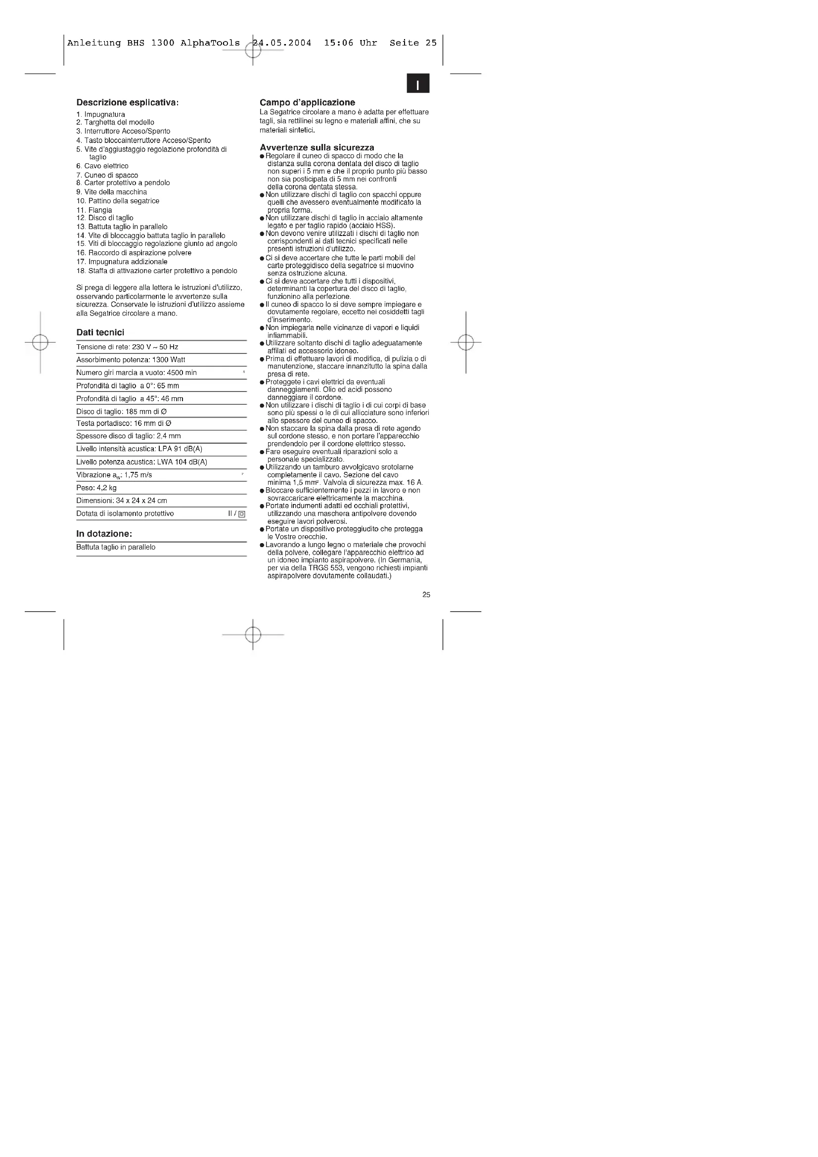Lavorando con la Segatrice circolare a mano Tenere sempre saldamente la Segatrice circolare. Il carter protettivo a pendolo viene auto- maticamente spinto indietro dal pezzo in lavoro. Non impiegare forza alcuna! Procedere leggermente ed uniformemente con la Segatrice circolare. Il pezzo di scarto si dovrebbe trovare sul lato destro della Segatrice circolare, affinché la parte larga del tavolo d’appoggio ne abbracci completamente la superficie. Segando seguendo una linea pretracciata, fare scorrere la Segatrice circolare lungo l’apposita scanalatura. Morsettare saldamente i pezzi di legno piccoli. Non tenerli con la sola mano. È assolutamente necessario osservare le norme di sicurezza! Portare occhiali protettivi! Non utilizzate dischi di taglio inoperanti oppure quelli evidenzianti spacchi o screpolature. Non utilizzate flange o madreflange con foro maggiore o minore a quello del rispettivo disco di taglio. Non si deve fermare il disco di taglio con la sola mano o premendovi lateralmente sullo stesso. Il carter protettivo a pendolo deve scorrere liberamente e, al termine di ogni fase lavorativa, si dovrà trovare nella posizione iniziale di partenza. Prima di utilizzare la Segatrice circolare, previo stacco della spina dalla presa di corrente, verificare il giusto funzionamento del carter protettivo. Prima di ogni utilizzo della macchina, accertarsi che i dispositivi di sicurezza, quali ad es. il carter a pendolo, cuneo di spacco, flangia e dispositivi di regolazione siano regolati e fissati bene e funzionino alla perfezione. Potete collegare al carter protettivo un idoneo dispositivo di aspirazione polvere. Rassicurarsi che codesto dispositivo di aspirazione polvere sia sicuramente e regolamentarmente collegato. Segando, non si deve morsettare il mobile carter protettivo a pendolo nel carter protettivo tirato indietro. Manutenzione Tenere liberi e puliti le fenditure di ventilazione sulla cassa del motore. Di tanto in quanto soffiarne via le impurità. In caso di eccessiva formazione di scintille, fate controllare le spazzole di carbone da una officina autorizzata. La sostituzione delle spazzole di carbone può avvenire soltanto da un’officina autorizzata o dal nostro Servizio Clientela. Tenete in Vostro apparecchio sempre pulito. Per pulire le parti in plastica non usare prodotti caustici. Avendo rilevato dei danni, potete ordinare il pezzo in questione presso il nostro Servizio Clientela, definendolo esattamente con l’ausilio del disegno in esploso e dell’elenco pezzi di ricambio qui allegati. Attenzione!Portare occhiali protettivi e dispositivoTaglio in parallelo1. Allentare la vite di fissaggio 1.2. Con taglio a 90°, regolare la battuta taglio in parallelo 2 sulla taccadella scala A, con taglio a 45°, regolare la battuta taglio in parallelo 2 sulla tacca della scala B, attenersi alla larghezza del disco di taglio.3. Serrare la vite di fissaggio.Attenzione!Effettuare un taglio di prova con un pezzo di legno da buttare.Regolazione profondità di taglio1. Allentare la vite di fissaggio 12. Girare all’insù il pattino della segatrice3. Regolare la profondità di taglio con l’ausilio della scala.La punta del dente deve fuoriuscire di ca. 2 mm dal legno4. Serrare la vite di fissaggio Anleitung BHS 1300 AlphaTools 24.05.2004 15:06 Uhr Seite 263