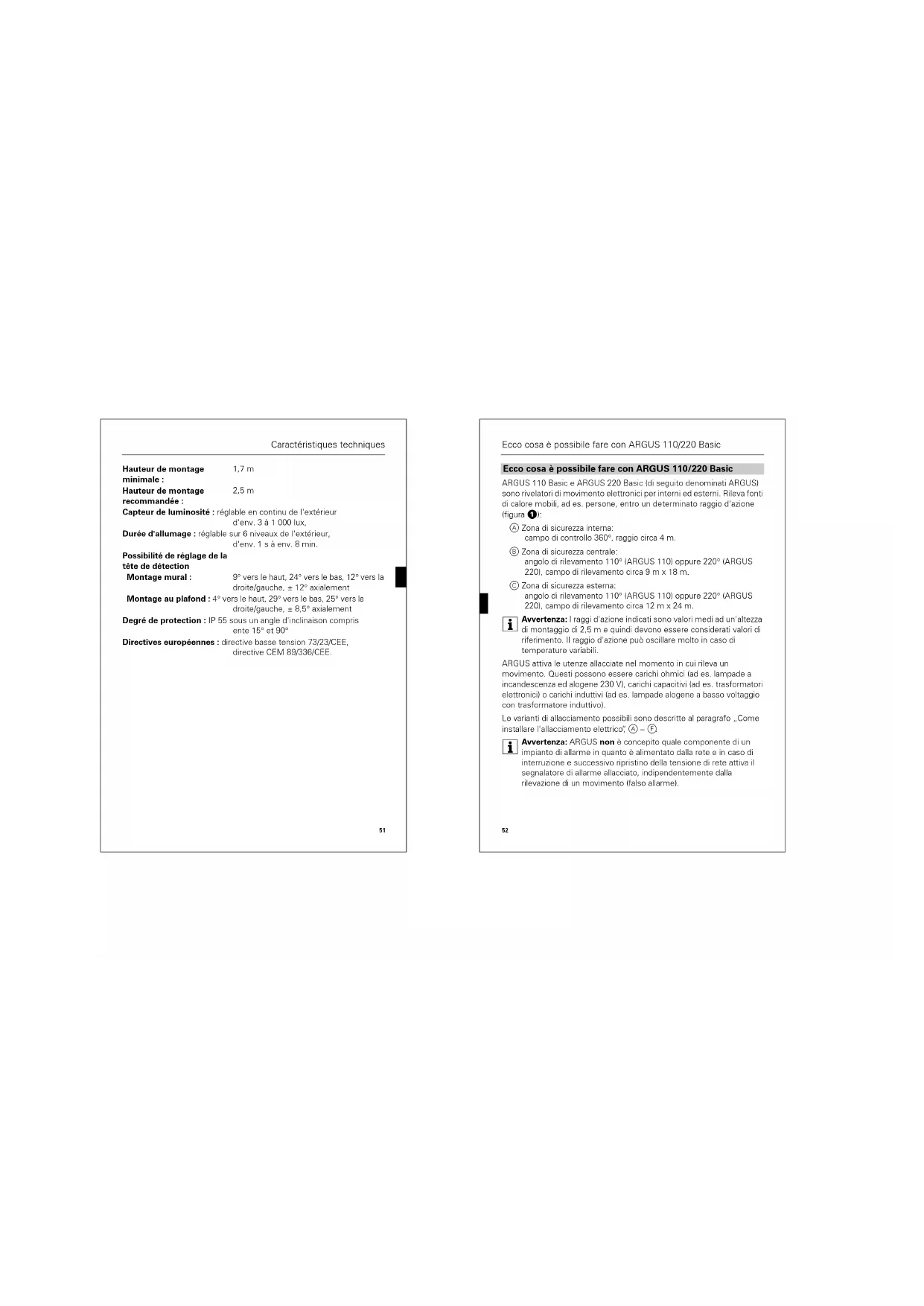 , lunghezza di spelatura 14 mm Diametro esterno di un cavo: max. 14,5 mm Campo di controllo: 110° (Argus 110) / 220° (Argus 220) Raggio d'azione: max. 12 m Numero dei livelli: 7 Numero delle zone: ARGUS 110: 92 zone con 368 settori ARGUS 220: 112 zone con 448 settori Altezza di montaggio minima: 1,7 m61 Dati tecnici Altezza di montaggio consigliata: 2,5 m Sensore di luminosità: regolabile in continuo dall'esterno, circa 3–1000 lux, Durata della commutazione: regolabile dall'esterno su 6 livelli, da circa 1 sec. a circa 8 min, Possibilità di regolazione della testa del sensore Montaggio a parete: 9° su, 24° giù, 12° destra/sinistra, ±12° assiale Montaggio a soffitto: 4° su, 29° giù, 25° destra/sinistra, ±8,5° assiale Tipo di protezione: IP 55 ad un angolo di inclinazione da 15° a 90° Direttive CE: direttiva sulla bassa tensione 73/23/CEE, direttiva sulla compatibilità elettromagnetica 89/336/CEE