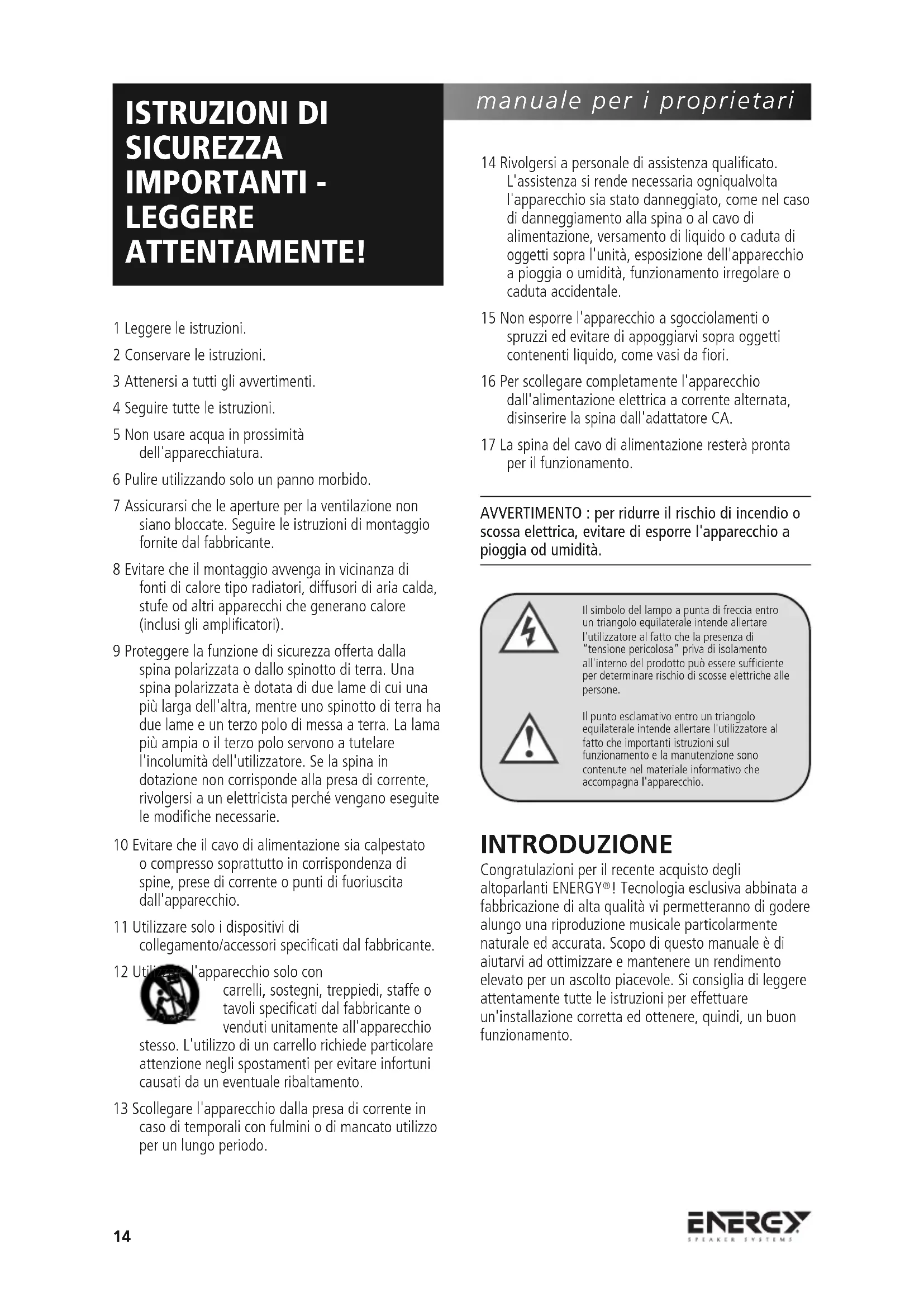 ESTADOS UNIDOS Y CANADÁ Favor de ver la garantía que aparece en la contraportada. 13manuale per i proprietari 1 Leggere le istruzioni. 2 Conservare le istruzioni. 3 Attenersi a tutti gli avvertimenti. 4 Seguire tutte le istruzioni. 5 Non usare acqua in prossimità dell'apparecchiatura. 6 Pulire utilizzando solo un panno morbido. 7 Assicurarsi che le aperture per la ventilazione non siano bloccate. Seguire le istruzioni di montaggio fornite dal fabbricante. 8 Evitare che il montaggio avvenga in vicinanza di fonti di calore tipo radiatori, diffusori di aria calda, stufe od altri apparecchi che generano calore (inclusi gli amplificatori). 9 Proteggere la funzione di sicurezza offerta dalla spina polarizzata o dallo spinotto di terra. Una spina polarizzata è dotata di due lame di cui una più larga dell'altra, mentre uno spinotto di terra ha due lame e un terzo polo di messa a terra. La lama più ampia o il terzo polo servono a tutelare l'incolumità dell'utilizzatore. Se la spina in dotazione non corrisponde alla presa di corrente, rivolgersi a un elettricista perché vengano eseguite le modifiche necessarie. 10 Evitare che il cavo di alimentazione sia calpestato o compresso soprattutto in corrispondenza di spine, prese di corrente o punti di fuoriuscita dall'apparecchio. 11 Utilizzare solo i dispositivi di collegamento/accessori specificati dal fabbricante. 12 Utilizzare l'apparecchio solo con carrelli, sostegni, treppiedi, staffe o tavoli specificati dal fabbricante o venduti unitamente all'apparecchio stesso. L'utilizzo di un carrello richiede particolare attenzione negli spostamenti per evitare infortuni causati da un eventuale ribaltamento. 13 Scollegare l'apparecchio dalla presa di corrente in caso di temporali con fulmini o di mancato utilizzo per un lungo periodo. 14 Rivolgersi a personale di assistenza qualificato. L'assistenza si rende necessaria ogniqualvolta l'apparecchio sia stato danneggiato, come nel caso di danneggiamento alla spina o al cavo di alimentazione, versamento di liquido o caduta di oggetti sopra l'unità, esposizione dell'apparecchio a pioggia o umidità, funzionamento irregolare o caduta accidentale. 15 Non esporre l'apparecchio a sgocciolamenti o spruzzi ed evitare di appoggiarvi sopra oggetti contenenti liquido, come vasi da fiori. 16 Per scollegare completamente l'apparecchio dall'alimentazione elettrica a corrente alternata, disinserire la spina dall'adattatore CA. 17 La spina del cavo di alimentazione resterà pronta per il funzionamento. AVVERTIMENTO : per ridurre il rischio di incendio o scossa elettrica, evitare di esporre l'apparecchio a pioggia od umidità. INTRODUZIONE Congratulazioni per il recente acquisto degli altoparlanti ENERGY