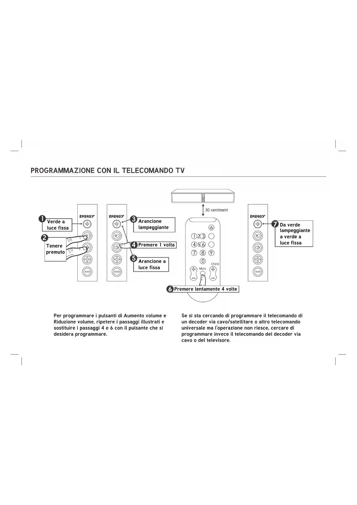 Per programmare i pulsanti di Aumento volume e Riduzione volume, ripetere i passaggi illustrati e sostituire i passaggi 4 e 6 con il pulsante che si desidera programmare. Se si sta cercando di programmare il telecomando di un decoder via cavo/satellitare o altro telecomando universale ma l’operazione non riesce, cercare di programmare invece il telecomando del decoder via cavo o del televisore.TECNOLOGIA WIRELESS BLUETOOTH