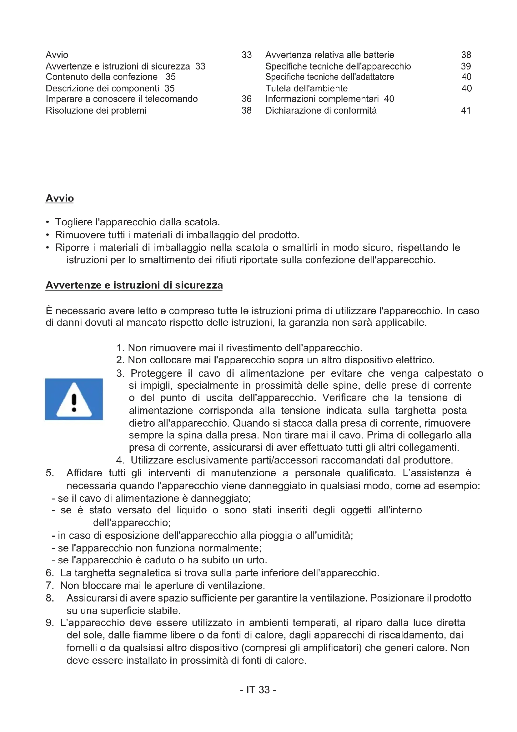 del sole, dalle amme libere o da fonti di calore, dagli apparecchi di riscaldamento, dai fornelli o da qualsiasi altro dispositivo (compresi gli amplicatori) che generi calore. Non deve essere inallato in prossimità di fonti di calore. Avvio 33 Avvertenze e istruzioni di sicurezza 33 Contenuto della confezione 35 Descrizione dei componenti 35 Imparare a conoscere il telecomando 36 Risoluzione dei problemi 38 Avvertenza relativa alle batterie 38 Speciche tecniche dell'apparecchio