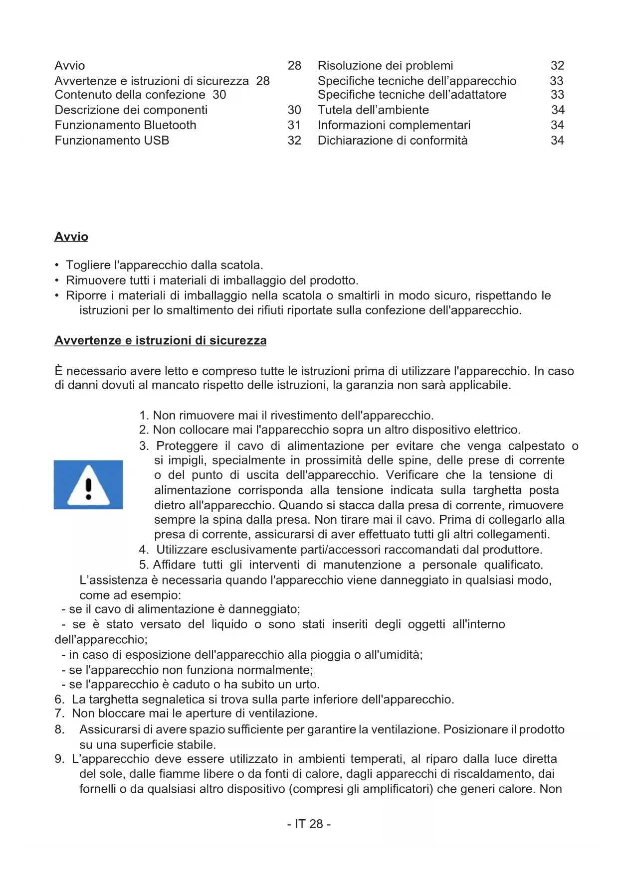 del sole, dalle amme libere o da fonti di calore, dagli apparecchi di riscaldamento, dai fornelli o da qualsiasi altro dispositivo (compresi gli amplicatori) che generi calore. Non Avvio 28 Avvertenze e istruzioni di sicurezza 28 Contenuto della confezione 30 Descrizione dei componenti 30 Funzionamento Bluetooth 31 Funzionamento USB 32 Risoluzione dei problemi 32 Speciche tecniche dell’apparecchio