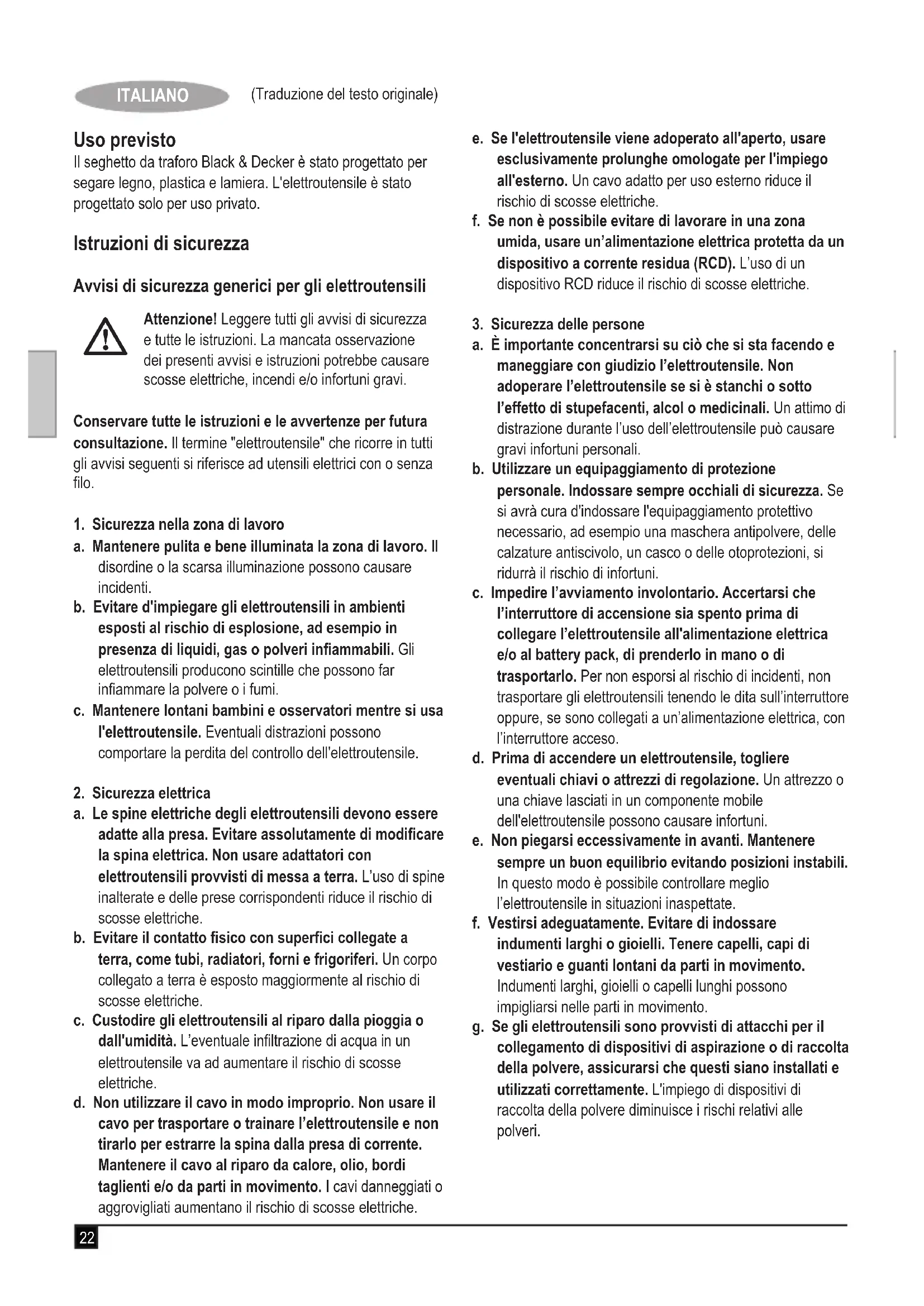 (6) in senso antiorario sulla posizione di taglio alternativo. In questa modalità, la guida per il taglio diritto è rientrata e il movimento oscillante è disattivato. Segatura u Tenere sempre l’elettroutensile con entrambe le mani. u Prima di iniziare a tagliare, lasciare che la lama ruoti liberamente per alcuni secondi. u Esercitare solo una leggera pressione sull’elettroutensile mentre si esegue il taglio. u Se possibile, lavorare con il piedino scorrimento lama (5) premuto contro il pezzo. In questo modo si esercita un maggior controllo sull’elettroutensile, riducendone al tempo stesso le vibrazioni e si evita anche che la lama subisca danni. Consigli per un utilizzo ottimale In generale u Usare una velocità alta per il legno, media per l’alluminio e il PVC e bassa per i metalli ad eccezione dell’alluminio. Segatura dei laminati Dato che la lama taglia sulla corsa verso l’alto, si potrebbe vericare la scheggiatura della supercie più vicina al piedino scorrimento lama. u Usare una lama da seghetto con denti sottili. u Segare dalla parte posteriore del pezzo da lavorare. u Per contenere al massimo la scheggiatura, ssare con un morsetto un pezzo di legno o di cartone da ambo i lati del pezzo da lavorare e segare i tre strati insieme. Segatura del metallo Tenere presente che la segatura del metallo richiede molto più tempo di quella del legno. u Usare una lama da sega idonea alla segatura del metallo. Usare una lama a denti sottili per i metalli ferrosi e una con i denti più grossi per quelli non ferrosi. u Quando si taglia un foglio di lamiera sottile, ssare con dei morsetti un pezzo di legno sulla supercie posteriore del pezzo da lavorare e tagliare i due strati insieme. u Spalmare un velo d’olio lungo la traccia del taglio. Accessori Le prestazioni dell'elettroutensile dipendono dall'accessorio usato. Gli accessori Black & Decker e Piranha sono stati fabbricati in base a standard qualitativi elevati e sono stati progettati per ottenere le migliori prestazioni dall’elettroutensile. Usando questi accessori si otterrà il meglio dall'elettroutensile. Questo elettroutensile può essere utilizzato con lame da seghetto con gambo a “U” o a “T”. Manutenzione Questo elettroutensile Black & Decker è stato progettato per funzionare a lungo con una manutenzione minima. Per ottenere prestazioni sempre soddisfacenti occorre avere cura dell'elettroutensile e sottoporlo a pulizia periodica. Attenzione! Prima di eseguire operazioni di manutenzione, spegnere l'elettroutensile ed estrarre la spina dalla presa di corrente. u Pulire regolarmente le prese di ventilazione dell’elettroutensile e dell’alimentatore con un pennello o con un panno morbido e asciutto.26 (Traduzione del testo originale) ITALIANO u Il vano del motore deve essere pulito regolarmente con un panno umido. Non usare materiali abrasivi o detergenti a base di solventi. u Versare di tanto in tanto una goccia d’olio sull’asse del rullo di supporto della lama. Sostituzione della spina (solo Regno Unito e Irlanda) Se è necessario montare una nuova spina: u smaltire in tutta sicurezza quella vecchia. u Collegare il lo marrone al morsetto sotto tensione della nuova spina. u Collegare il lo blu al morsetto neutro. Attenzione! Non effettuare nessun collegamento sul morsetto di terra. Seguire le istruzioni fornite con le spine di buona qualità. Fusibile raccomandato: 5 A. Protezione dell’ambiente