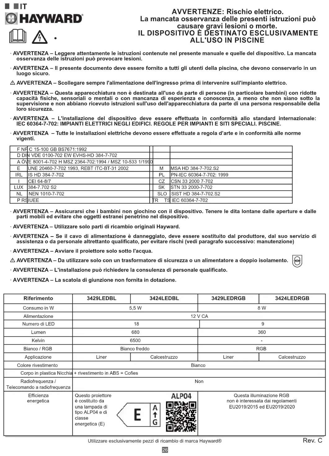 Utilizzare esclusivamente pezzi di ricambio di marca Hayward® Rev. C UTILIZZO Modalità autonoma (solo proiettore colore RVB) In assenza di una scatola RC, i proiettori funzionano autonomamente e l'utente può scegliere tra 18 modalità: 11 colori fissi e 7 sequenze di cambio colore automatico (vedi tabella delle sequenze qui di seguito). Sequenza Colore/Programma Sequenza Colore/Programma 1 Colore: Bianco 10 Colore: Verde 2 Colore: Blu 11* Colore: Verde smeraldo 3 Colore: Laguna blu 12 Programma: Alternanza di colori veloce 4 Colore: Ciano 13 Programma: Alternanza di colori lenta 5 Colore: Porpora 14 Programma:11colorissi 6 Colore: Magenta 15 Programma: Psichedelico 7 Colore: Rosa 16 Programma: Blu/ciano/bianco 8 Colore: Rosso 17 Programma: Colori casuali 1 9 Colore: Arancione 18 Programma: Colori casuali 2 *: Sequenza eventualmente personalizzabile utilizzando e collegando il centro di controllo. Il cambio di colore può essere ottenuto spegnendo l'alimentazione dei proiettori per un tempo molto breve (<1 s). Tramite interruzioni successive, è possibile scorrere le 18 modalità operative. Dopo la modalità 18, i proiettori tornano alla prima sequenza automatica (modalità 1). Per sincronizzare i proiettori passando contemporaneamente alla modalità 2, è necessario spegnere l'alimentazione per circa 2 s. Quando si accende il proiettore dopo un'interruzione di alcuni secondi (>4 s), il proiettore si accende in bianco per 15 s e poi torna alla modalità in cui si trovava al momento dell'ultimo spegnimento. Questo permette di ottenere la massima illuminazione nel caso in cui il proiettore venga fatto cadere accidentalmente nella vasca. Sicurezza (solo proiettore colore RVB) Se la temperatura all'interno della lampadina aumenta in modo anomalo, un dispositivo di sicurezza interrompe l'illuminazione e la lampadina emette dei flash rossi. Non appena la temperatura torna normale, la lampadina riprende a funzionare. In caso di rilevamento di una tensione troppo bassa (<11 V) o troppo alta (>15 V), la lampadina smette di funzionare ed emette flash verdi. Per ripristinare il funzionamento normale, è indispensabile interrompere l'alimentazione dei proiettori. MANUTENZIONE In caso di sostituzione di componenti, è necessario utilizzare pezzi di ricambio originali. La sostituzione della lampadina deve essere sostituita fuori dall'acqua. La sostituzione della sorgente luminosa contenuta in questa illuminazione deve essere effettuata esclusivamente dal produttore o dal suo agente di assistenza o da personale con qualifiche equivalenti. Quando si sostituisce la lampadina e/o il cavo, si raccomanda di sostituire tutte le parti che garantiscano la tenuta stagna. Durante la sostituzione della lampadina, è necessario sostituire la guarnizione e gli elementi di tenuta. Assicurarsi di montarli correttamente. In caso di guasto, è necessario sostituire l'intera lampadina a LED. Non aprire o tentare di ripararla. Per evitare incidenti, se il cavo di alimentazione o la guaina del cavo sono danneggiati, questi devono essere sostituiti dal produttore, da un Centro di assistenza autorizzato o da un tecnico qualificato. Il cavo deve soddisfare i seguenti requisiti meccanici ed elettrici: H05RN-F con una sezione minima di 2x1,5 mm