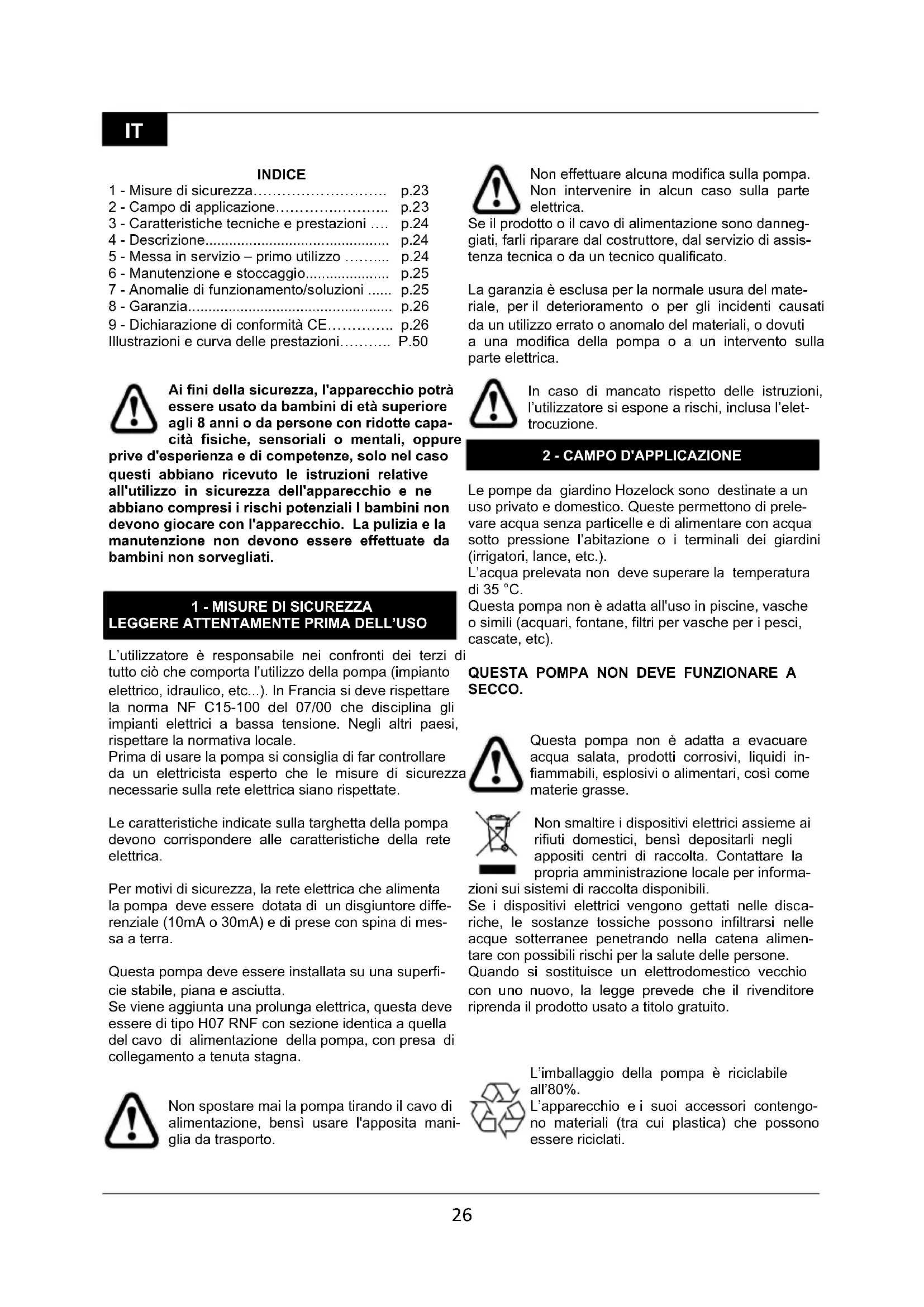 Non spostare mai la pompa tirando il cavo di alimentazione, bensì usare l'apposita mani- glia da trasporto. Non effettuare alcuna modifica sulla pompa. Non intervenire in alcun caso sulla parte elettrica. Se il prodotto o il cavo di alimentazione sono danneg- giati, farli riparare dal costruttore, dal servizio di assis- tenza tecnica o da un tecnico qualificato. La garanzia è esclusa per la normale usura del mate- riale, per il deterioramento o per gli incidenti causati da un utilizzo errato o anomalo del materiali, o dovuti a una modifica della pompa o a un intervento sulla parte elettrica. In caso di mancato rispetto delle istruzioni, l’utilizzatore si espone a rischi, inclusa l’elet- trocuzione.