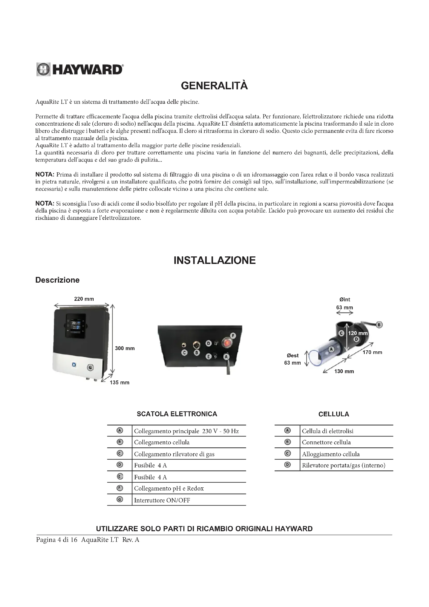 Dati da conservare Nota REGISTRAZIONEUTILIZZARE SOLO PARTI DI RICAMBIO ORIGINALI HAYWARD Pagina 4 di 16 AquaRite LT Rev. A GENERALITÀ AquaRite LT è un sistema di trattamento dell’acqua delle piscine. Permette di trattare efficacemente l’acqua della piscina tramite elettrolisi dell’acqua salata. Per funzionare, l’elettrolizzatore richiede una ridotta concentrazione di sale (cloruro di sodio) nell’acqua della piscina. AquaRite LT disinfetta automaticamente la piscina trasformando il sale in cloro libero che distrugge i batteri e le alghe presenti nell’acqua. Il cloro si ritrasforma in cloruro di sodio. Questo ciclo permanente evita di fare ricorso al trattamento manuale della piscina. AquaRite LT è adatto al trattamento della maggior parte delle piscine residenziali. La quantità necessaria di cloro per trattare correttamente una piscina varia in funzione del numero dei bagnanti, delle precipitazioni, della temperatura dell’acqua e del suo grado di pulizia... NOTA: Prima di installare il prodotto sul sistema di filtraggio di una piscina o di un idromassaggio con l’area relax o il bordo vasca realizzati in pietra naturale, rivolgersi a un installatore qualificato, che potrà fornire dei consigli sul tipo, sull’installazione, sull’impermeabilizzazione (se necessaria) e sulla manutenzione delle pietre collocate vicino a una piscina che contiene sale. NOTA: Si sconsiglia l’uso di acidi come il sodio bisolfato per regolare il pH della piscina, in particolare in regioni a scarsa piovosità dove l’acqua della piscina è esposta a forte evaporazione e non è regolarmente diluita con acqua potabile. L’acido può provocare un aumento dei residui che rischiano di danneggiare l’elettrolizzatore. INSTALLAZIONE Descrizione 220 mm300 mmØest 63 mm Øint 63 mm120 mm135 mm170 mm130 mm SCATOLA ELETTRONICA