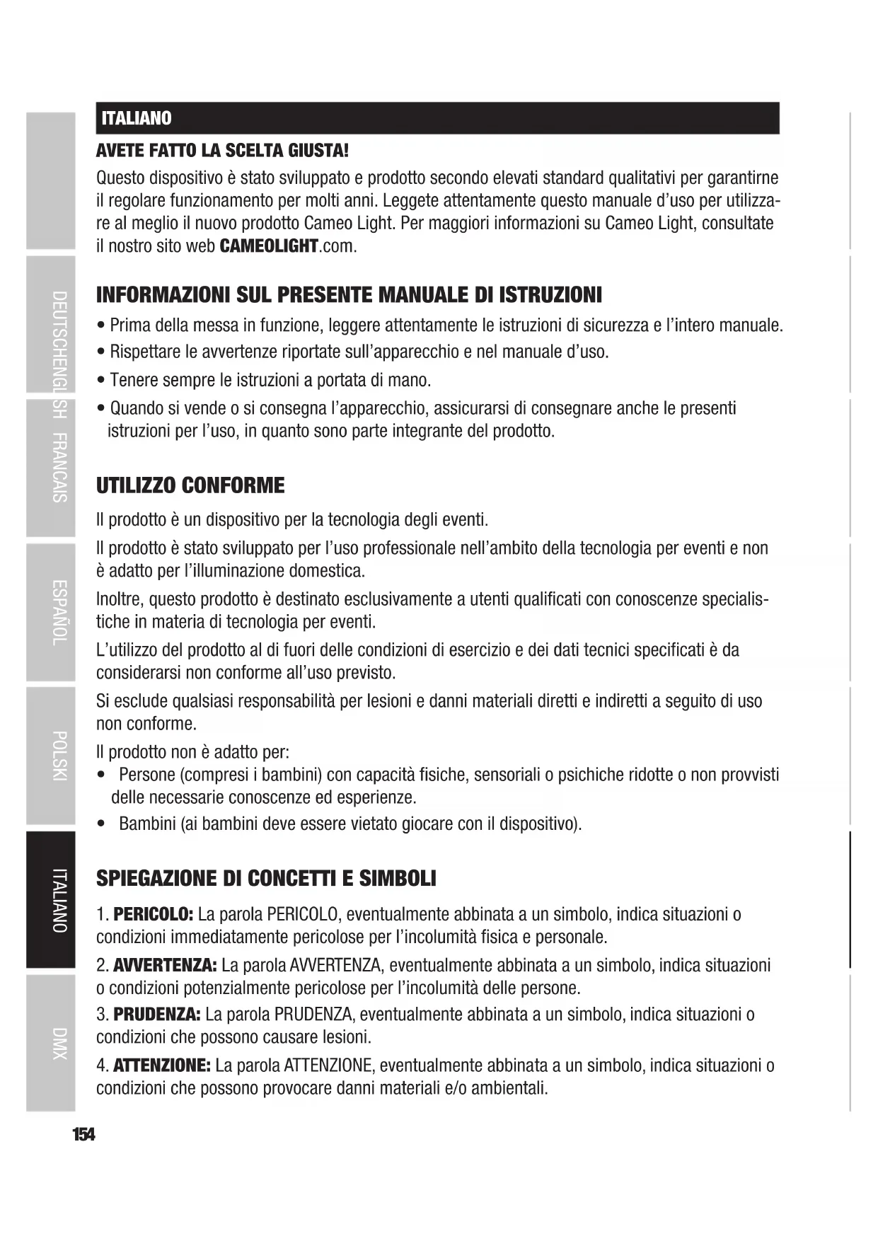 condizioni che possono provocare danni materiali e/o ambientali.155 DMX DEUTSCHFRANCAIS ESPAÑOL ENGLISH ITALIANO POLSKI Questo simbolo indica un pericolo che può causare scosse elettriche. Questo simbolo indica punti di pericolo o situazioni pericolose. Questo simbolo indica un pericolo dovuto a superfici calde. Questo simbolo indica pericoli dovuti a fonti di luce intense. Questo simbolo indica un dispositivo che non contiene parti sostituibili dall'utente. Questo simbolo indica informazioni complementari sull'utilizzo del prodotto.