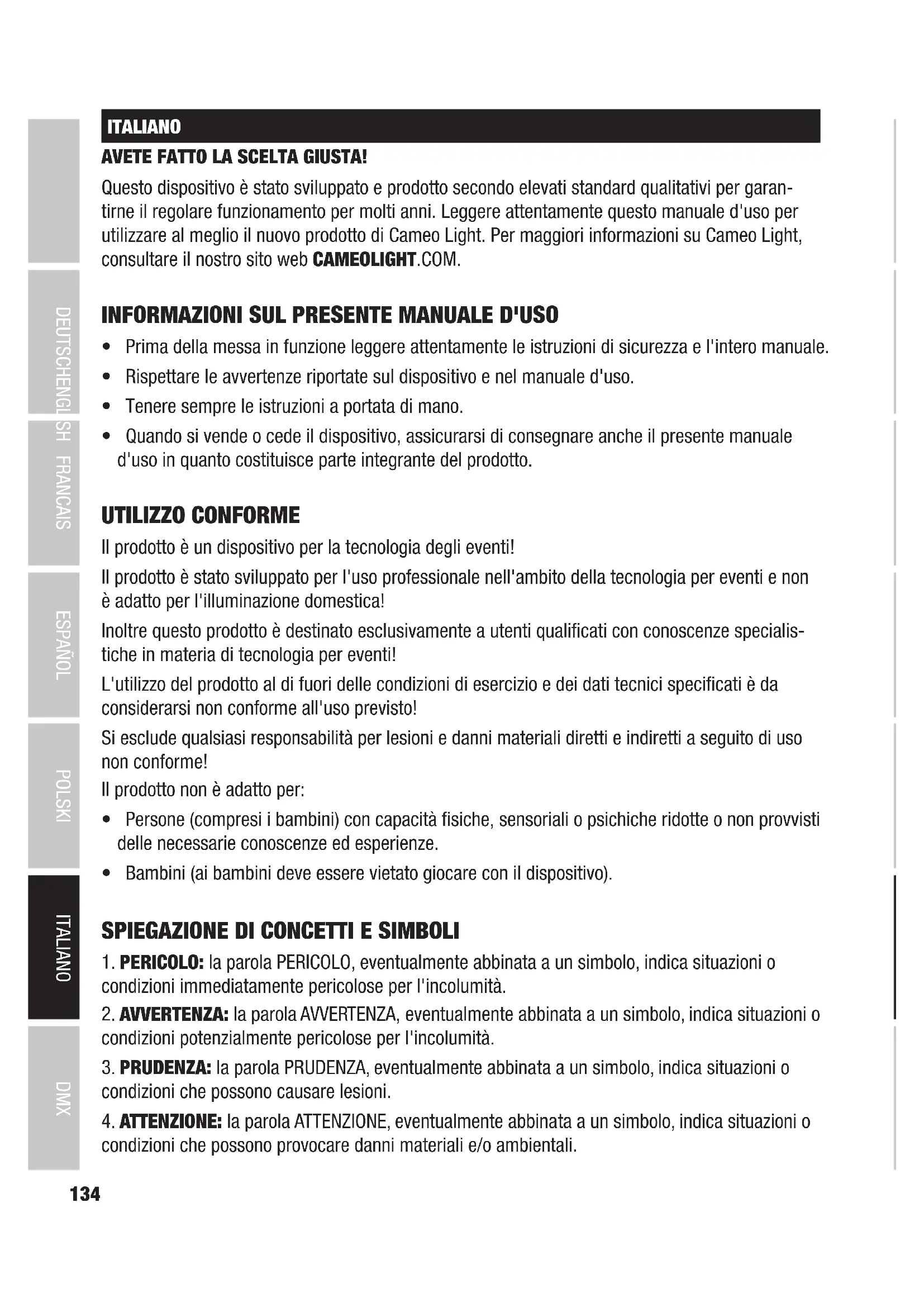 POWER OUT Presa di uscita Power Twist bianca. Serve per l'alimentazione di altri proiettori CAMEO. Assicurarsi che il totale della potenza assorbita di tutti i dispositivi collegati all'apparecchio non superi il valore indicato in ampere (A).141 DMX DEUTSCHFRANCAIS ESPAÑOL ENGLISH ITALIANO POLSKI