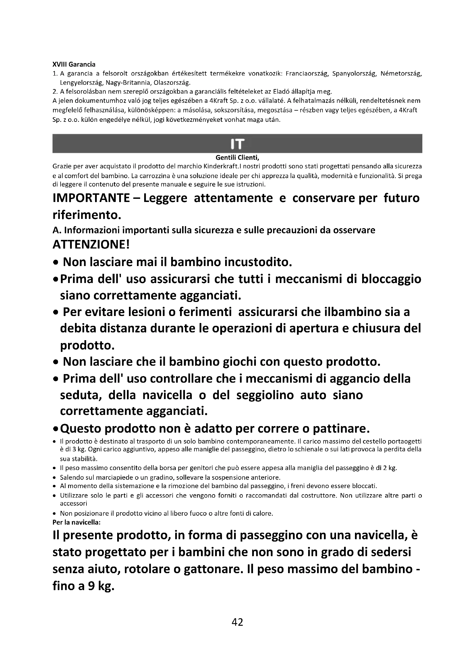 Non lavare a secco Non piegare o conservare il prodotto quando è bagnato e non conservarlo in condizioni di umidità, il che potrebbe provocare la formazione di muffa. XVIII Garanzia 1. Tutti i Prodotti della Kinderkraft sono coperti dalla garanzia di 24 mesi. Il periodo di copertura della garanzia decorre dalla data di consegna del prodotto all'Acquirente. 2. La garanzia è valida per i prodotti venduti nei seguenti paesi: Francia, Spagna, Germania, Polonia, Regno Unito, Italia.