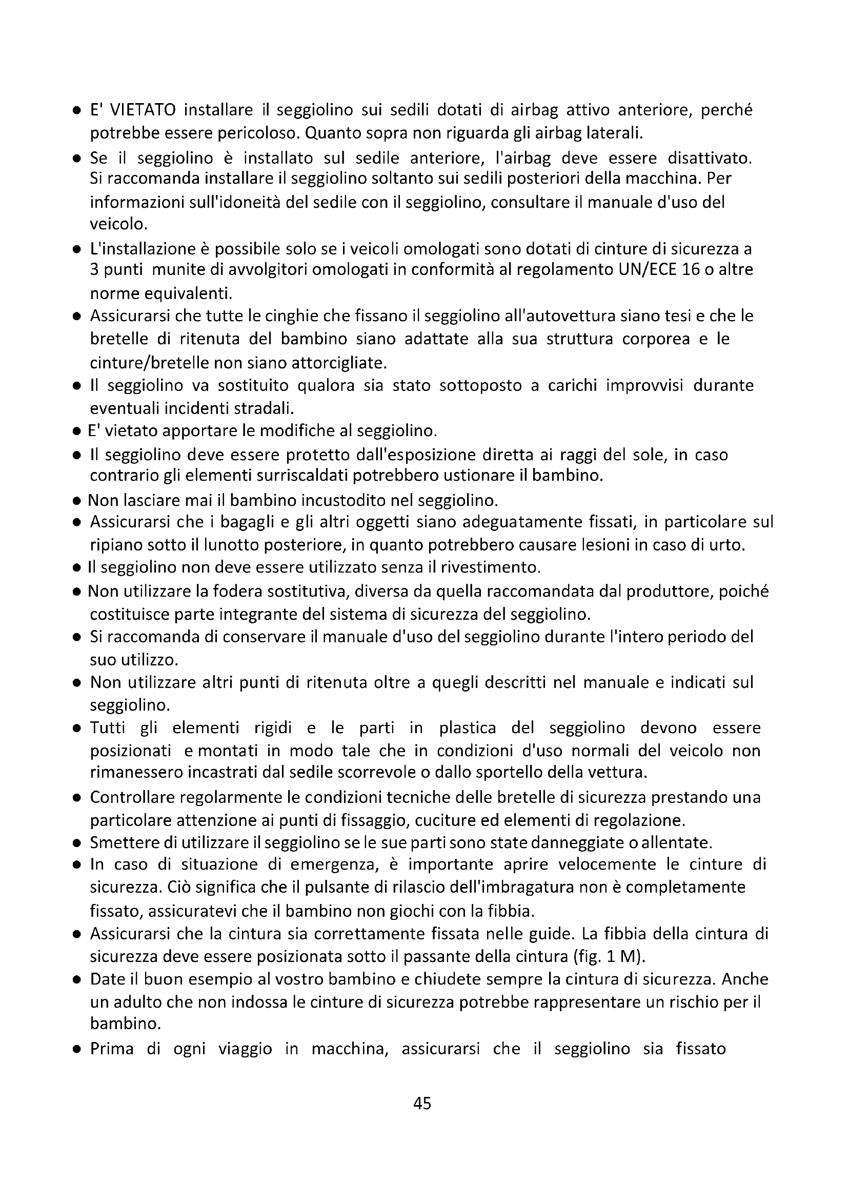 Si prega di dedicare alcuni minuti per leggere il presente manuale d'uso per garantire la dovuta sicurezza al bambino. Numerosi traumi da evitare sono causati da un uso improprio ed imprudente del seggiolino ● Il seggiolino deve essere fissato sul veicolo in posizione opposta alla marcia con cinture di sicurezza inerziali a 3 punti.45 ● E' VIETATO installare il seggiolino sui sedili dotati di airbag attivo anteriore, perché potrebbe essere pericoloso. Quanto sopra non riguarda gli airbag laterali. ● Se il seggiolino è installato sul sedile anteriore, l'airbag deve essere disattivato. Si raccomanda installare il seggiolino soltanto sui sedili posteriori della macchina. Per informazioni sull'idoneità del sedile con il seggiolino, consultare il manuale d'uso del veicolo. ● L'installazione è possibile solo se i veicoli omologati sono dotati di cinture di sicurezza a 3 punti munite di avvolgitori omologati in conformità al regolamento UN/ECE 16 o altre norme equivalenti. ● Assicurarsi che tutte le cinghie che fissano il seggiolino all'autovettura siano tesi e che le bretelle di ritenuta del bambino siano adattate alla sua struttura corporea e le cinture/bretelle non siano attorcigliate. ● Il seggiolino va sostituito qualora sia stato sottoposto a carichi improvvisi durante eventuali incidenti stradali. ● E' vietato apportare le modifiche al seggiolino. ● Il seggiolino deve essere protetto dall'esposizione diretta ai raggi del sole, in caso contrario gli elementi surriscaldati potrebbero ustionare il bambino. ● Non lasciare mai il bambino incustodito nel seggiolino. ● Assicurarsi che i bagagli e gli altri oggetti siano adeguatamente fissati, in particolare sul ripiano sotto il lunotto posteriore, in quanto potrebbero causare lesioni in caso di urto. ● Il seggiolino non deve essere utilizzato senza il rivestimento. ● Non utilizzare la fodera sostitutiva, diversa da quella raccomandata dal produttore, poiché costituisce parte integrante del sistema di sicurezza del seggiolino. ● Si raccomanda di conservare il manuale d'uso del seggiolino durante l'intero periodo del suo utilizzo. ● Non utilizzare altri punti di ritenuta oltre a quegli descritti nel manuale e indicati sul seggiolino. ● Tutti gli elementi rigidi e le parti in plastica del seggiolino devono essere posizionati e montati in modo tale che in condizioni d'uso normali del veicolo non rimanessero incastrati dal sedile scorrevole o dallo sportello della vettura. ● Controllare regolarmente le condizioni tecniche delle bretelle di sicurezza prestando una particolare attenzione ai punti di fissaggio, cuciture ed elementi di regolazione. ● Smettere di utilizzare il seggiolino se le sue parti sono state danneggiate o allentate. ● In caso di situazione di emergenza, è importante aprire velocemente le cinture di sicurezza. Ciò significa che il pulsante di rilascio dell'imbragatura non è completamente fissato, assicuratevi che il bambino non giochi con la fibbia. ● Assicurarsi che la cintura sia correttamente fissata nelle guide. La fibbia della cintura di sicurezza deve essere posizionata sotto il passante della cintura (fig. 1 M). ● Date il buon esempio al vostro bambino e chiudete sempre la cintura di sicurezza. Anche un adulto che non indossa le cinture di sicurezza potrebbe rappresentare un rischio per il bambino. ● Prima di ogni viaggio in macchina, assicurarsi che il seggiolino sia fissato46 correttamente. ● Fissare il seggiolino con le cinture di sicurezza anche quando non è in uso. Il seggiolino non ancorato potrebbe provocare lesioni ai passeggeri anche in caso di frenata di emergenza. ● Attenzione! Non posizionare il seggiolino auto su di un piano rialzato quale ad esempio: tavolo, ripiano, letto, ecc., in quanto sussiste il rischio di caduta. IMPORTANTE! CONSERVARE PER FUTURO RIFERIMENTO. Utilizzando il sedile auto come culla reclinata (EN 12790:2009): AVVERTENZA!: ● Non lasciare mai il bambino senza sorveglianza. ● Non utilizzare il prodotto quando il tuo bambino può sedersi da solo ● Il prodotto non è predisposta per dormite lunghe. ● Posizionare la sdraio su superfici rialzate, p. es. su un tavolo, può essere pericoloso. ● Utilizzare sempre il sistema delle cinture. ● Il prodotto non può sostituire il lettino o il letto. Se il vostro bambino ha bisogno di dormire, dovrebbe essere posizionato nel lettino o letto. ● Non utilizzare il prodotto se qualunque dei suoi elementi risulta danneggiato o mancante. ● Non utilizzare ne accessori ne parti di ricambio diversi da quelli raccomandati dal produttore.