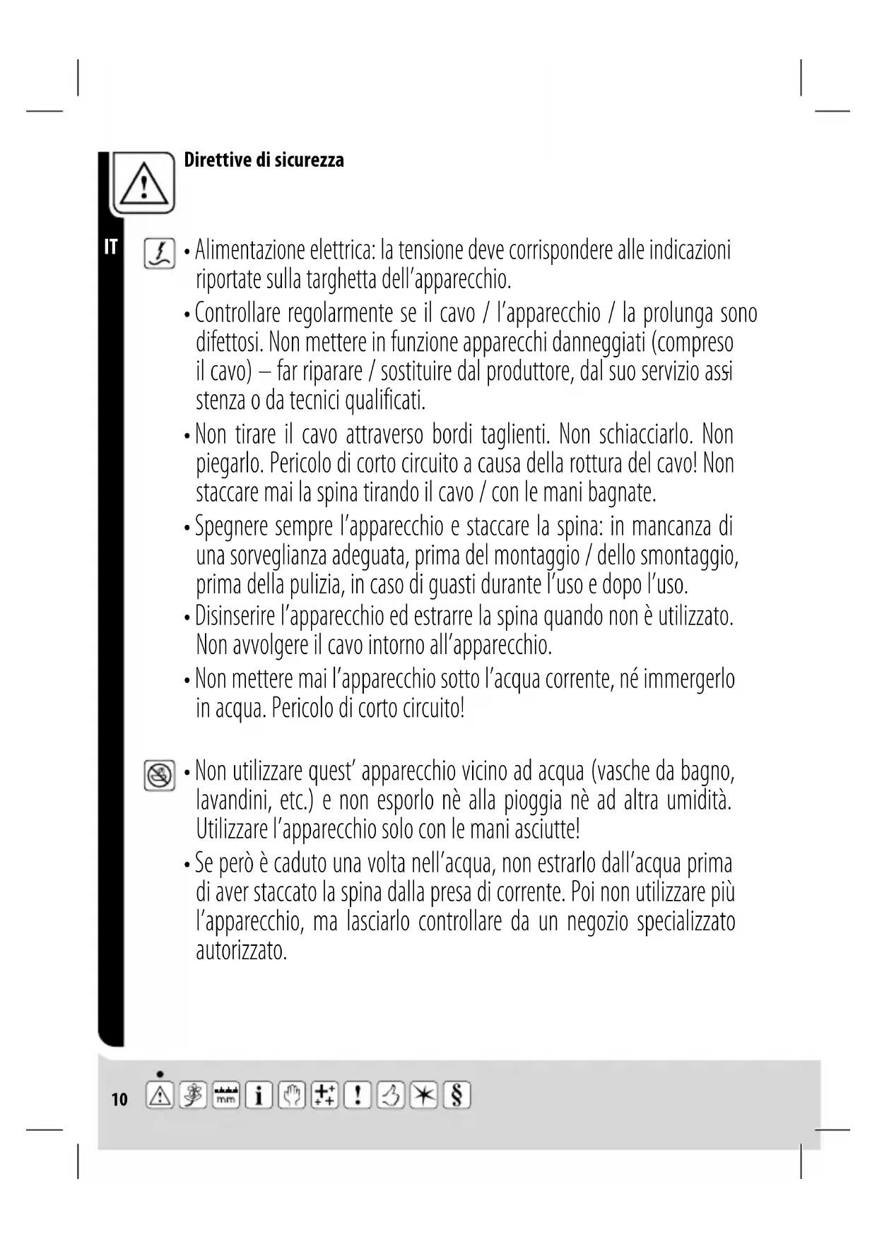 - Non utilizzare quest’ apparecchio vicino ad acqua (vasche da bagno, lavandini, etc.) e non esporlo nè alla pioggia nè ad altra umidità. Utilizzare l’apparecchio solo con le mani asciutte!11 Direttive di sicurezza