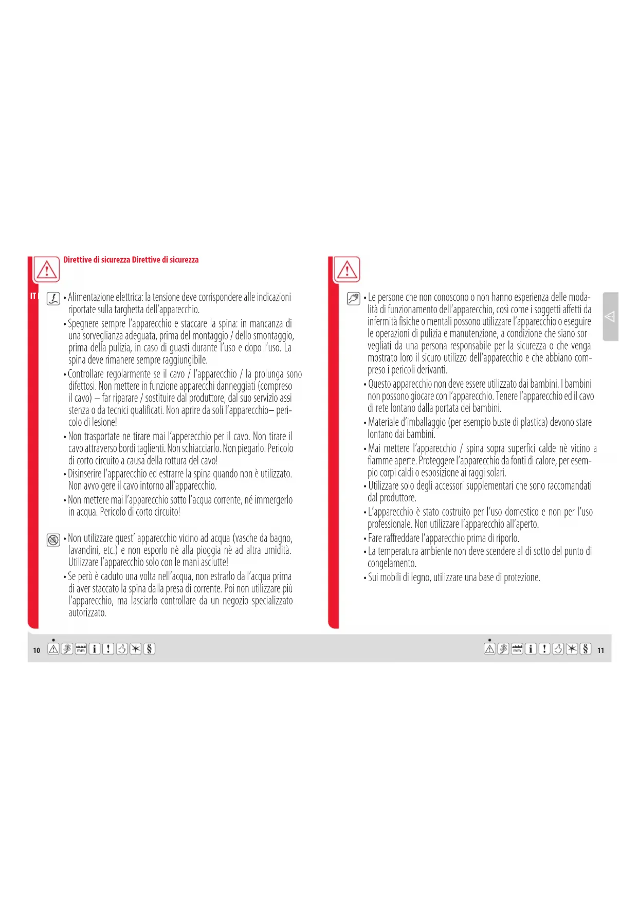 - Le riparazioni degli apparecchi elettrici devono unicamente essere effettuate da specialisti. Le riparazioni improprie possono causare dei pericoli gravi per l’utente. Direttive di sicurezza