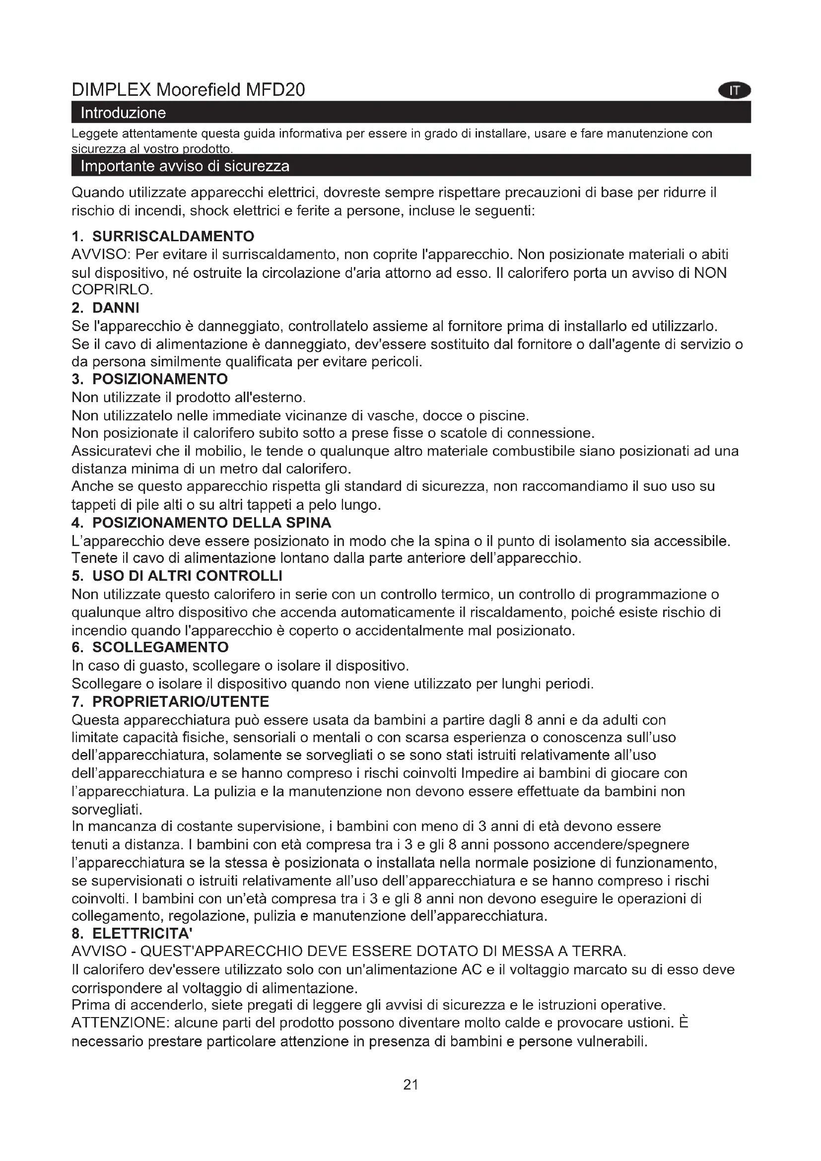 AVVISO - QUEST'APPARECCHIO DEVE ESSERE DOTATO DI MESSA A TERRA. Il calorifero dev'essere utilizzato solo con un'alimentazione AC e il voltaggio marcato su di esso deve corrispondere al voltaggio di alimentazione. Prima di accenderlo, siete pregati di leggere gli avvisi di sicurezza e le istruzioni operative. ATTENZIONE: alcune parti del prodotto possono diventare molto calde e provocare ustioni. È necessario prestare particolare attenzione in presenza di bambini e persone vulnerabili.22 Informazioni generali Usate solo acqua decalcicata in questo apparecchio. Questo modello è progettato per essere indipendente e normalmente posizionato vicino ad un muro. Assicuratevi sempre che l'apparecchio sia posizionato su un pavimento in piano. Anche se questo apparecchio rispetta gli standard di sicurezza, non raccomandiamo il suo uso su tappeti di pile alti o su altri tappeti a pelo lungo. Nota bene: Utilizzato in un ambiente con un rumore di fondo molto basso, è possibile udire un suono che è collegato all'utilizzo dell'effetto amma. Questo è normale e non deve costituire motivo di preoccupazione. Se questo prodotto subisce un picco di alimentazione, per qualunque motivo, potrebbe staccarsi. Questa è una normale caratteristica di sicurezza e il prodotto riprenderà a funzionare dopo 30 secondi. Una volta installato, non spostate mai il calorifero né posizionatelo disteso senza svuotare il serbatoio dell'acqua e il pozzetto. Se non intendete utilizzare l'apparecchio per più di due settimane, svuotate il serbatoio dell'acqua ed il pozzetto ed asciugate il pozzetto di scarico. Il serbatoio dell'acqua, il pozzetto, il coperchio di quest'ultimo, il coperchio del serbatoio e i ltri dell'aria devono essere puliti una volta ogni due settimane, specialmente nelle aree con acqua dura. L'apparecchio non dovrebbe mai essere utilizzato se le lampade non sono funzionanti. Le lampade devono essere regolarmente ispezionate come descritto nelle sezioni "Manutenzione" e "Sostituzione lampade". Informazioni tecniche Modello N.: MFD20 Emissione di calore 230V 240V Emissione di calore nominale P Nom