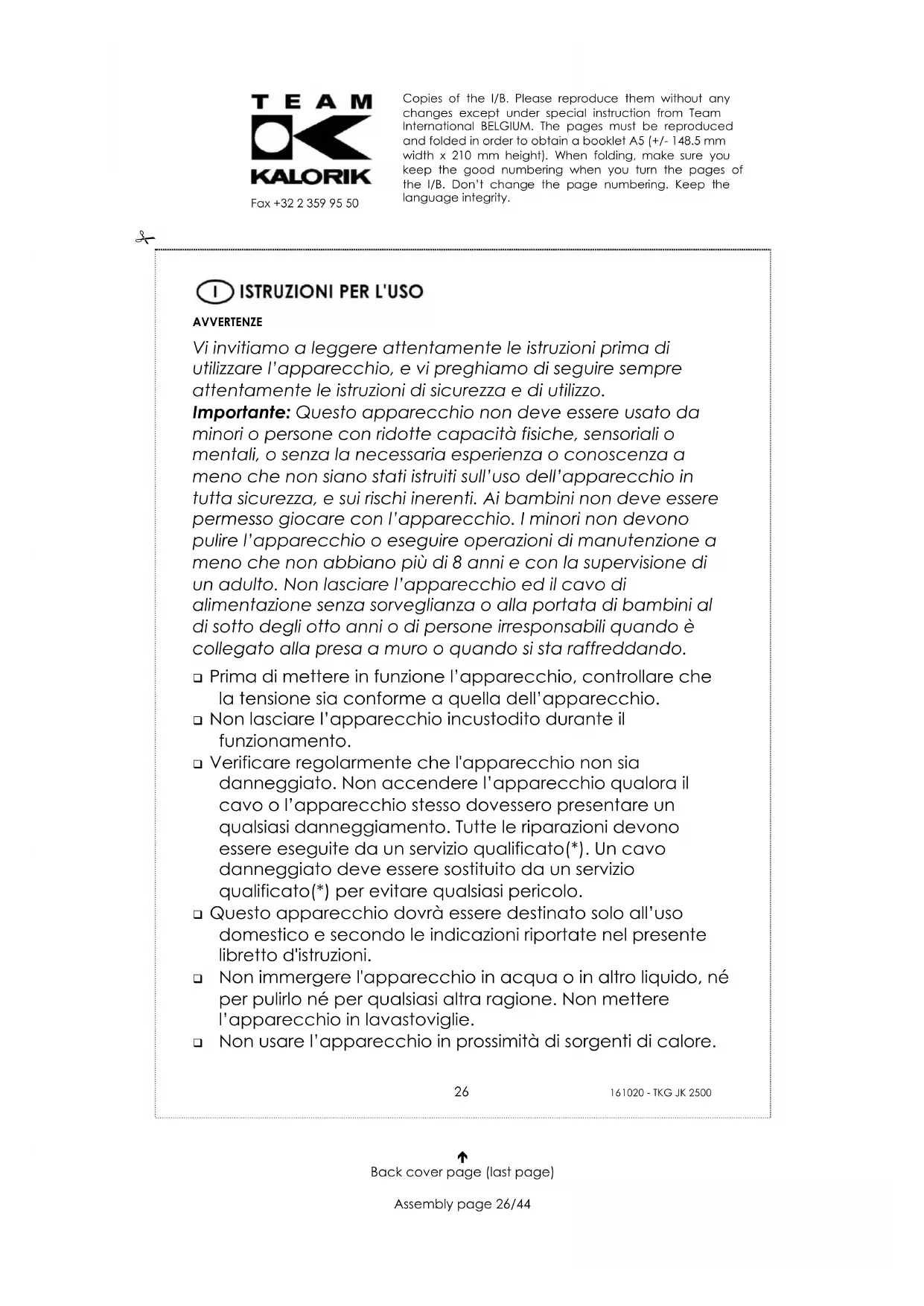 AVVERTENZE Vi invitiamo a leggere attentamente le istruzioni prima di utilizzare l’apparecchio, e vi preghiamo di seguire sempre attentamente le istruzioni di sicurezza e di utilizzo. Importante: Questo apparecchio non deve essere usato da minori o persone con ridotte capacità fisiche, sensoriali o mentali, o senza la necessaria esperienza o conoscenza a meno che non siano stati istruiti sull’uso dell’apparecchio in tutta sicurezza, e sui rischi inerenti. Ai bambini non deve essere permesso giocare con l’apparecchio. I minori non devono pulire l’apparecchio o eseguire operazioni di manutenzione a meno che non abbiano più di 8 anni e con la supervisione di un adulto. Non lasciare l’apparecchio ed il cavo di alimentazione senza sorveglianza o alla portata di bambini al di sotto degli otto anni o di persone irresponsabili quando è collegato alla presa a muro o quando si sta raffreddando. Prima di mettere in funzione l’apparecchio, controllare che la tensione sia conforme a quella dell’apparecchio. Non lasciare l’apparecchio incustodito durante il funzionamento. Verificare regolarmente che l'apparecchio non sia danneggiato. Non accendere l’apparecchio qualora il cavo o l’apparecchio stesso dovessero presentare un qualsiasi danneggiamento. Tutte le riparazioni devono essere eseguite da un servizio qualificato(*). Un cavo danneggiato deve essere sostituito da un servizio qualificato(*) per evitare qualsiasi pericolo. Questo apparecchio dovrà essere destinato solo all’uso domestico e secondo le indicazioni riportate nel presente libretto d'istruzioni. Non immergere l'apparecchio in acqua o in altro liquido, né per pulirlo né per qualsiasi altra ragione. Non mettere l’apparecchio in lavastoviglie. Non usare l’apparecchio in prossimità di sorgenti di calore. Copies of the I/B. Please reproduce them without any changes except under special instruction from Team International BELGIUM. The pages must be reproduced and folded in order to obtain a booklet A5 (+/- 148.5 mm width x 210 mm height). When folding, make sure you keep the good numbering when you turn the pages of the I/B. Don’t change the page numbering. Keep the language integrity.