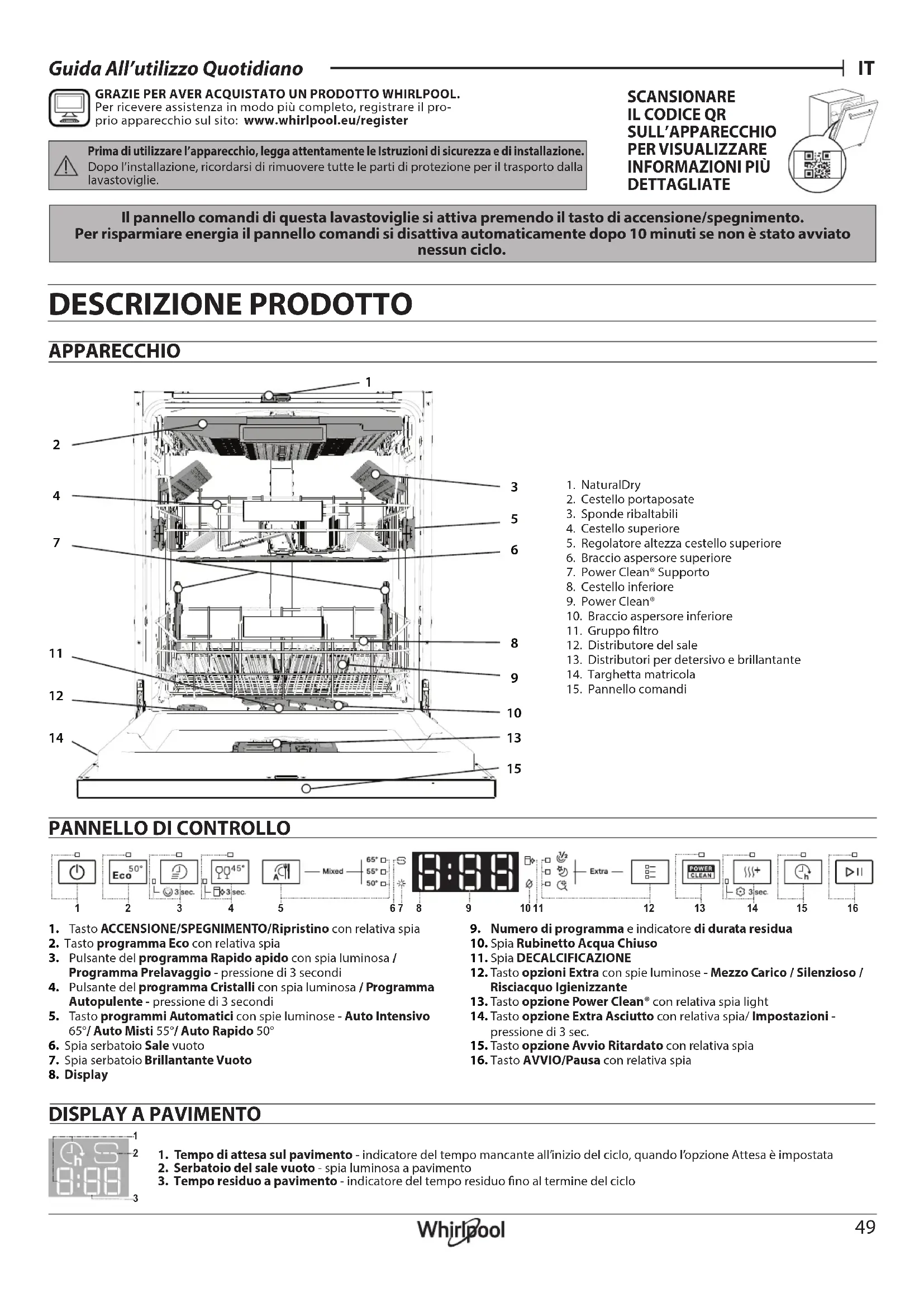 1. Tempo di attesa sul pavimento - indicatore del tempo mancante all’inizio del ciclo, quando l’opzione Attesa è impostata 2. Serbatoio del sale vuoto - spia luminosa apavimento3. Tempo residuo apavimento - indicatore del tempo residuo no al termine del cicloGRAZIE PER AVER ACQUISTATO UN PRODOTTO WHIRLPOOL. Per ricevere assistenza in modo più completo, registrare il pro-prio apparecchio sul sito: www.whirlpool.eu/registerPrima di utilizzare l’apparecchio, legga attentamente le Istruzioni di sicurezza e di installazione.Dopo l’installazione, ricordarsi di rimuovere tutte le parti di protezione per il trasporto dalla lavastoviglie. SCANSIONARE