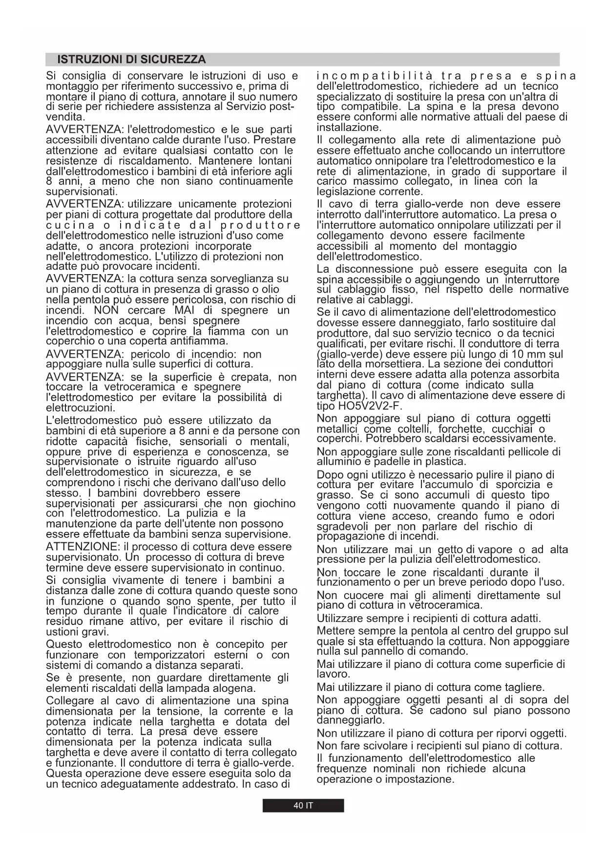 8,7 kW(NG) 8,3 kW(LPG) 829 l/h 604 g/h 220-240 V/ 50-60 Hz40 IT AVVERTENZA: utilizzare unicamente protezioni per piani di cottura progettate dal produttore della c u c i n a o i n d i c a t e d a l p r o d u t t o r e dell'elettrodomestico nelle istruzioni d'uso come adatte, o ancora protezioni incorporate nell'elettrodomestico. L'utilizzo di protezioni non adatte può provocare incidenti. AVVERTENZA: se la superficie è crepata, non toccare la vetroceramica e spegnere l'elettrodomestico per evitare la possibilità di elettrocuzioni. ATTENZIONE: il processo di cottura deve essere supervisionato. Un processo di cottura di breve termine deve essere supervisionato in continuo. Si consiglia vivamente di tenere i bambini a distanza dalle zone di cottura quando queste sono in funzione o quando sono spente, per tutto il tempo durante il quale l'indicatore di calore residuo rimane attivo, per evitare il rischio di ustioni gravi. AVVERTENZA: l'elettrodomestico e le sue parti accessibili diventano calde durante l'uso. Prestare attenzione ad evitare qualsiasi contatto con le resistenze di riscaldamento. Mantenere lontani dall'elettrodomestico i bambini di età inferiore agli 8 anni, a meno che non siano continuamente supervisionati. Se è presente, non guardare direttamente gli elementi riscaldati della lampada alogena. L'elettrodomestico può essere utilizzato da bambini di età superiore a 8 anni e da persone con ridotte capacità fisiche, sensoriali o mentali, oppure prive di esperienza e conoscenza, se supervisionate o istruite riguardo all'uso dell'elettrodomestico in sicurezza, e se comprendono i rischi che derivano dall'uso dello stesso. I bambini dovrebbero essere supervisionati per assicurarsi che non giochino con l'elettrodomestico. La pulizia e la manutenzione da parte dell'utente non possono essere effettuate da bambini senza supervisione. Collegare al cavo di alimentazione una spina dimensionata per la tensione, la corrente e la potenza indicate nella targhetta e dotata del contatto di terra. La presa deve essere dimensionata per la potenza indicata sulla targhetta e deve avere il contatto di terra collegato e funzionante. Il conduttore di terra è giallo-verde. Questa operazione deve essere eseguita solo da un tecnico adeguatamente addestrato. In caso di AVVERTENZA: la cottura senza sorveglianza su un piano di cottura in presenza di grasso o olio nella pentola può essere pericolosa, con rischio di incendi. NON cercare MAI di spegnere un incendio con acqua, bensì spegnere l'elettrodomestico e coprire la fiamma con un coperchio o una coperta antifiamma. AVVERTENZA: pericolo di incendio: non appoggiare nulla sulle superfici di cottura. Si consiglia di conservare le istruzioni di uso e montaggio per riferimento successivo e, prima di montare il piano di cottura, annotare il suo numero di serie per richiedere assistenza al Servizio post- vendita. Questo elettrodomestico non è concepito per funzionare con temporizzatori esterni o con sistemi di comando a distanza separati.