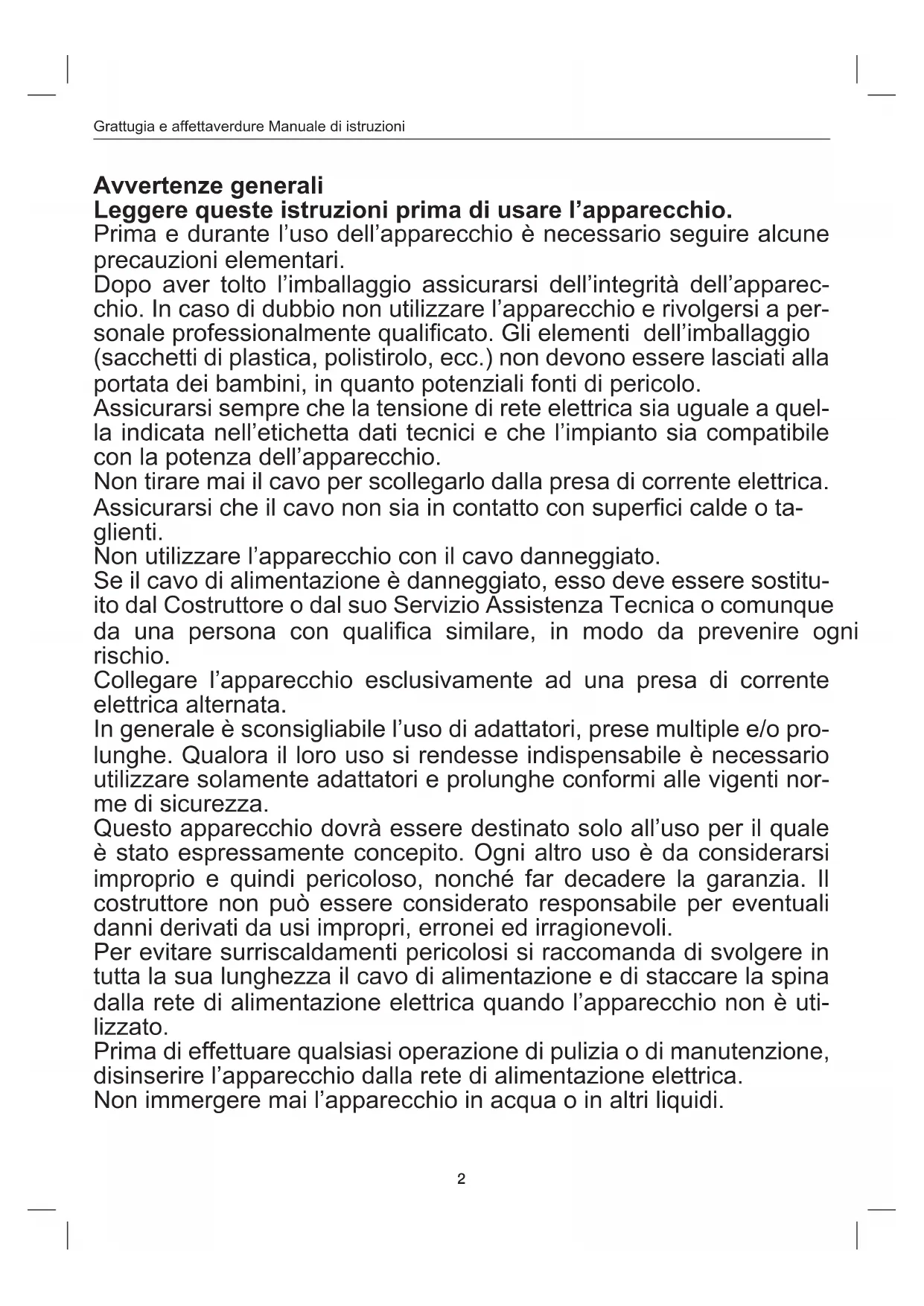Avvertenze generali Leggere queste istruzioni prima di usare l’apparecchio. Prima e durante l’uso dell’apparecchio è necessario seguire alcune precauzioni elementari. Dopo aver tolto l’imballaggio assicurarsi dell’integrità dell’apparec- chio. In caso di dubbio non utilizzare l’apparecchio e rivolgersi a per- sonale professionalmente qualicato. Gli elementi dell’imballaggio (sacchetti di plastica, polistirolo, ecc.) non devono essere lasciati alla portata dei bambini, in quanto potenziali fonti di pericolo. Assicurarsi sempre che la tensione di rete elettrica sia uguale a quel- la indicata nell’etichetta dati tecnici e che l’impianto sia compatibile con la potenza dell’apparecchio. Non tirare mai il cavo per scollegarlo dalla presa di corrente elettrica. Assicurarsi che il cavo non sia in contatto con superci calde o ta- glienti. Non utilizzare l’apparecchio con il cavo danneggiato. Se il cavo di alimentazione è danneggiato, esso deve essere sostitu- ito dal Costruttore o dal suo Servizio Assistenza Tecnica o comunque da una persona con qualica similare, in modo da prevenire ogni rischio. Collegare l’apparecchio esclusivamente ad una presa di corrente elettrica alternata. In generale è sconsigliabile l’uso di adattatori, prese multiple e/o pro- lunghe. Qualora il loro uso si rendesse indispensabile è necessario utilizzare solamente adattatori e prolunghe conformi alle vigenti nor- me di sicurezza. Questo apparecchio dovrà essere destinato solo all’uso per il quale è stato espressamente concepito. Ogni altro uso è da considerarsi improprio e quindi pericoloso, nonché far decadere la garanzia. Il costruttore non può essere considerato responsabile per eventuali danni derivati da usi impropri, erronei ed irragionevoli. Per evitare surriscaldamenti pericolosi si raccomanda di svolgere in tutta la sua lunghezza il cavo di alimentazione e di staccare la spina dalla rete di alimentazione elettrica quando l’apparecchio non è uti- lizzato. Prima di effettuare qualsiasi operazione di pulizia o di manutenzione, disinserire l’apparecchio dalla rete di alimentazione elettrica. Non immergere mai l’apparecchio in acqua o in altri liquidi.Grattugia e affettaverdure Manuale di istruzioni
