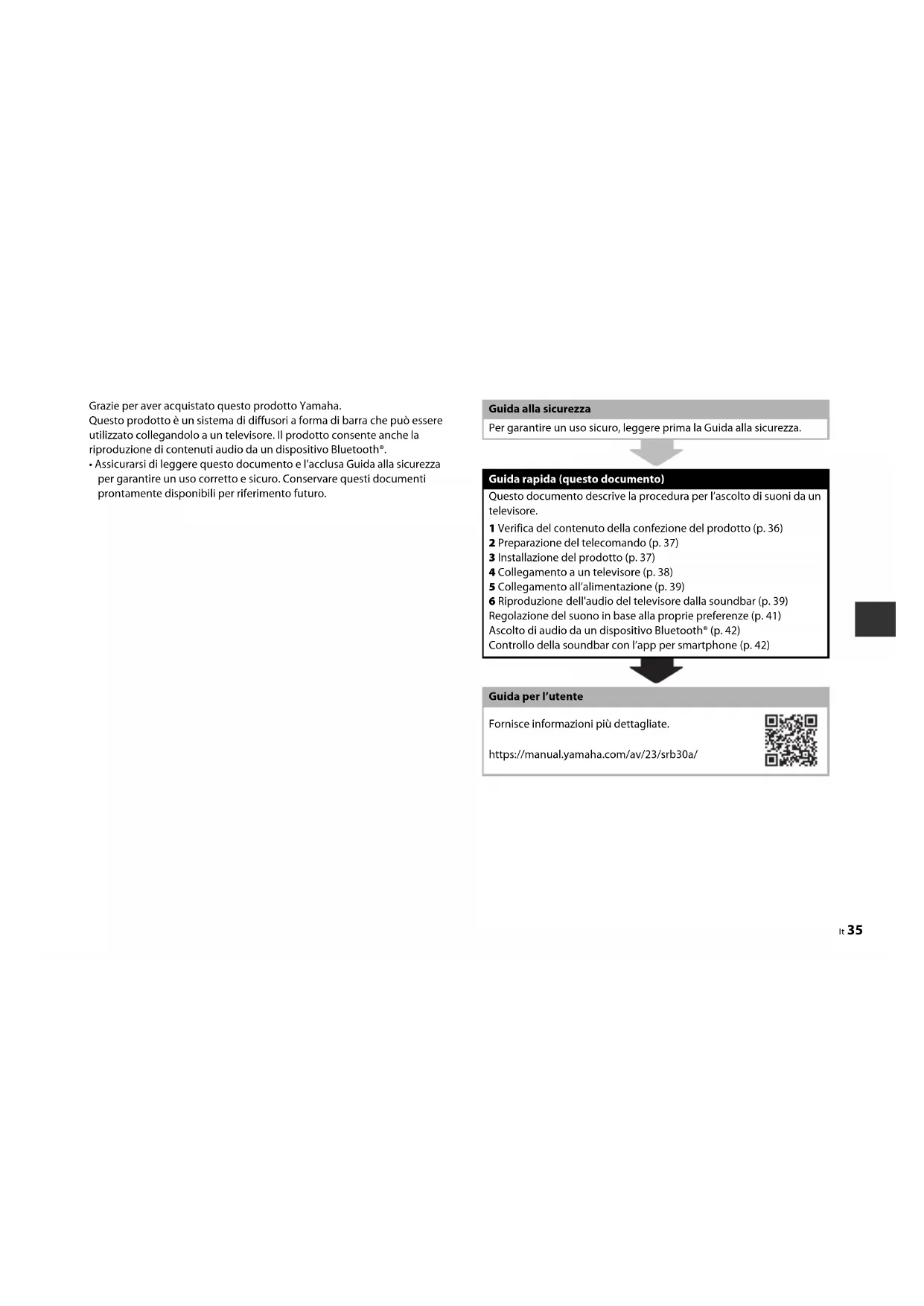 - Assicurarsi di leggere questo documento e l’acclusa Guida alla sicurezza per garantire un uso corretto e sicuro. Conservare questi documenti prontamente disponibili per riferimento futuro. Guida alla sicurezza Per garantire un uso sicuro, leggere prima la Guida alla sicurezza. Guida rapida (questo documento) Questo documento descrive la procedura per l’ascolto di suoni da un televisore. 1 Verifica del contenuto della confezione del prodotto (p. 36) 2 Preparazione del telecomando (p. 37) 3 Installazione del prodotto (p. 37) 4 Collegamento a un televisore (p. 38) 5 Collegamento all’alimentazione (p. 39) 6 Riproduzione dell'audio del televisore dalla soundbar (p. 39) Regolazione del suono in base alla proprie preferenze (p. 41) Ascolto di audio da un dispositivo Bluetooth® (p. 42) Controllo della soundbar con l’app per smartphone (p. 42) Guida per l’utente Fornisce informazioni più dettagliate. https://manual.yamaha.com/av/23/srb30a/36 It