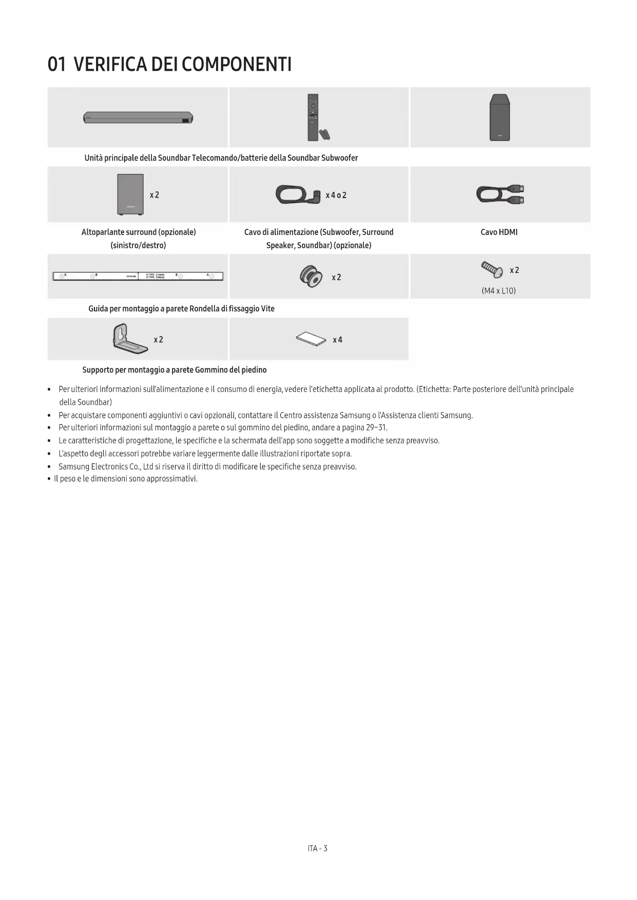 SOUNDBAR Unità principale della Soundbar Telecomando/batterie della Soundbar Subwoofer POWER x 2 x 4 o 2 Altoparlante surround (opzionale) (sinistro/destro) Cavo di alimentazione (Subwoofer, Surround Speaker, Soundbar) (opzionale) Cavo HDMI x 2 x 2 (M4 x L10) Guida per montaggio a parete Rondella di ssaggio Vite x 2 x 4 Supporto per montaggio a parete Gommino del piedino