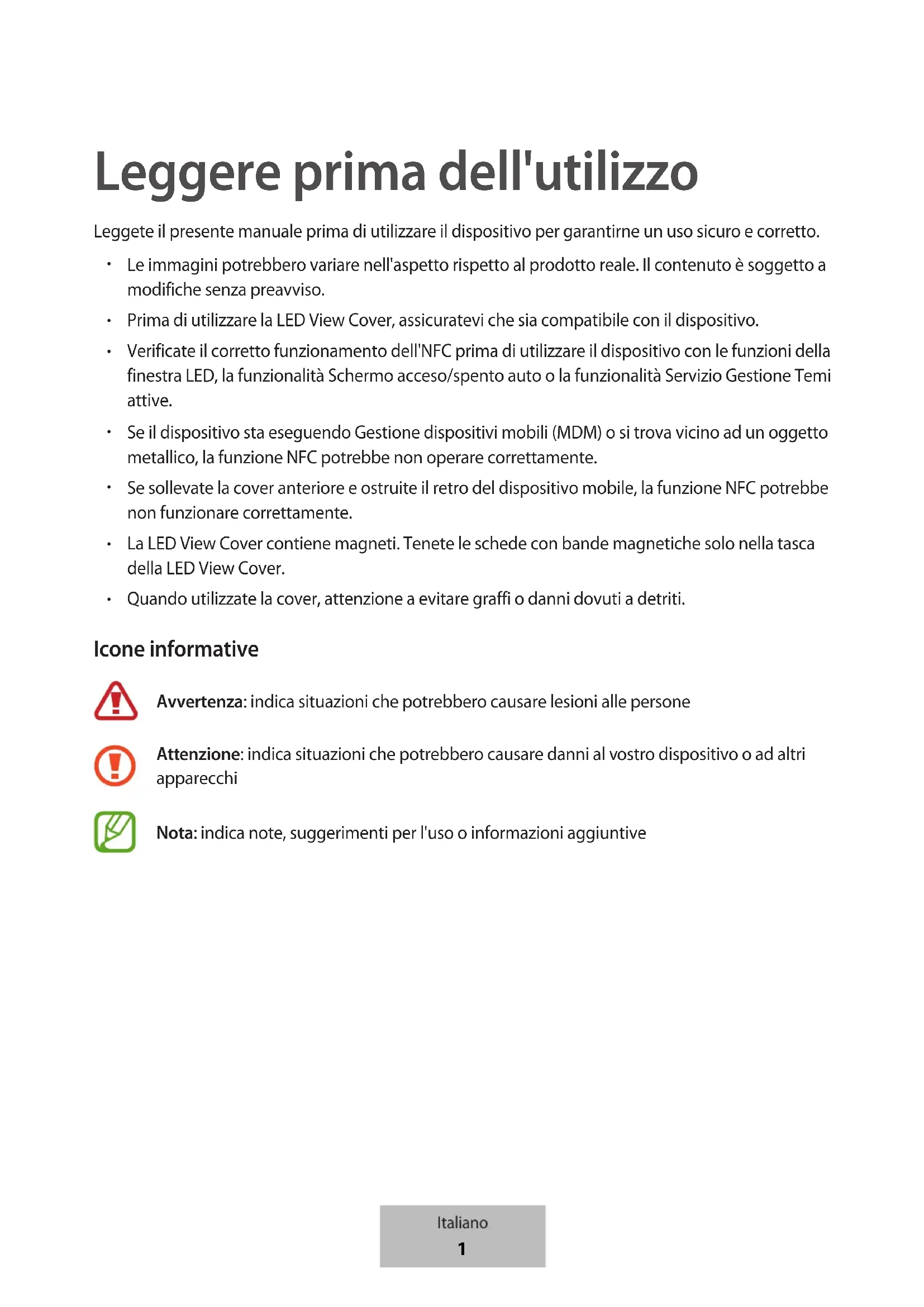 Quando utilizzate la cover, attenzione a evitare graffi o danni dovuti a detriti. Icone informative Avvertenza: indica situazioni che potrebbero causare lesioni alle persone Attenzione: indica situazioni che potrebbero causare danni al vostro dispositivo o ad altri apparecchi Nota: indica note, suggerimenti per l'uso o informazioni aggiuntive Italiano