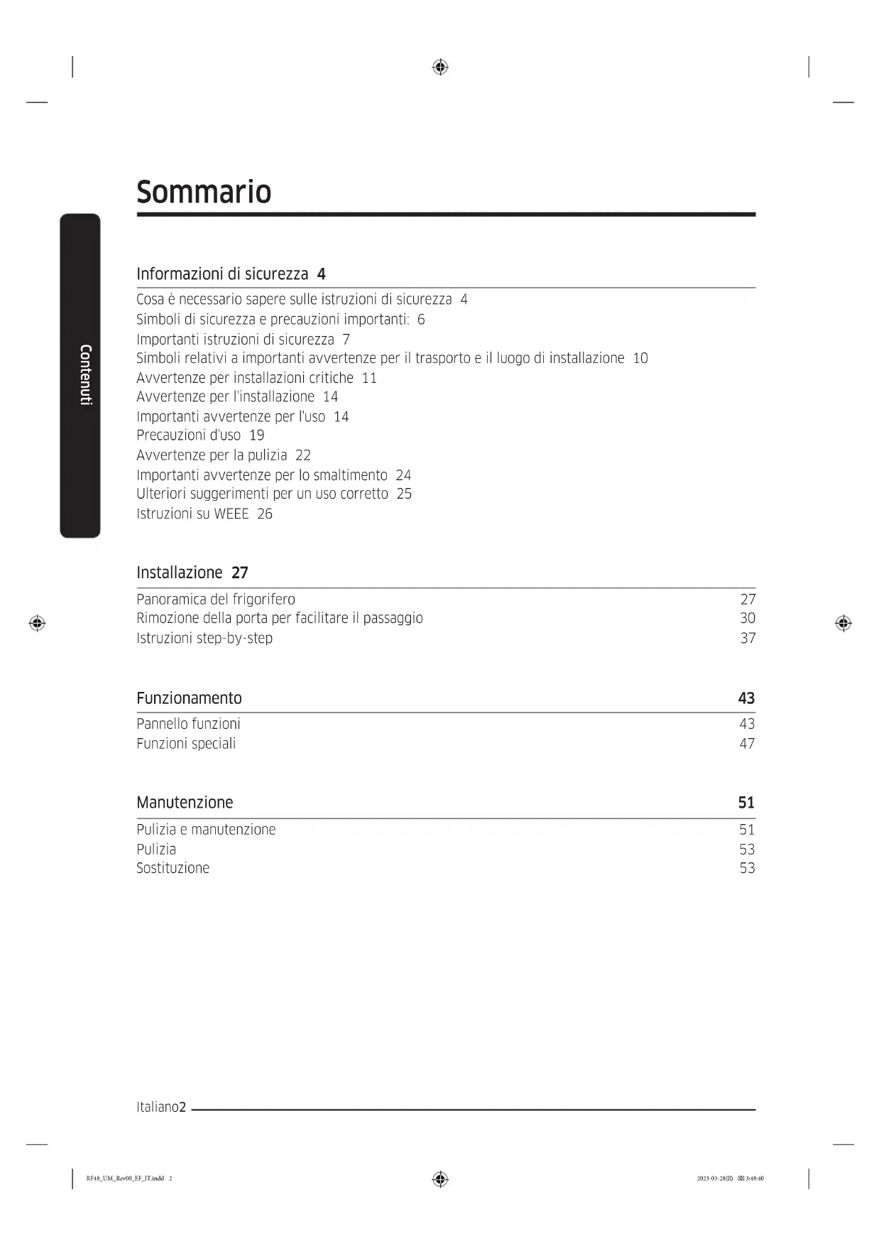 - A causa dell'equalizzazione della pressione, durante l'apertura e la chiusura della porta si avvertono dei fruscii. RF48_UM_Rev00_EF_IT.indd 57 2023-03-28() 3:48:47Italiano58 Appendice Istruzioni di sicurezza