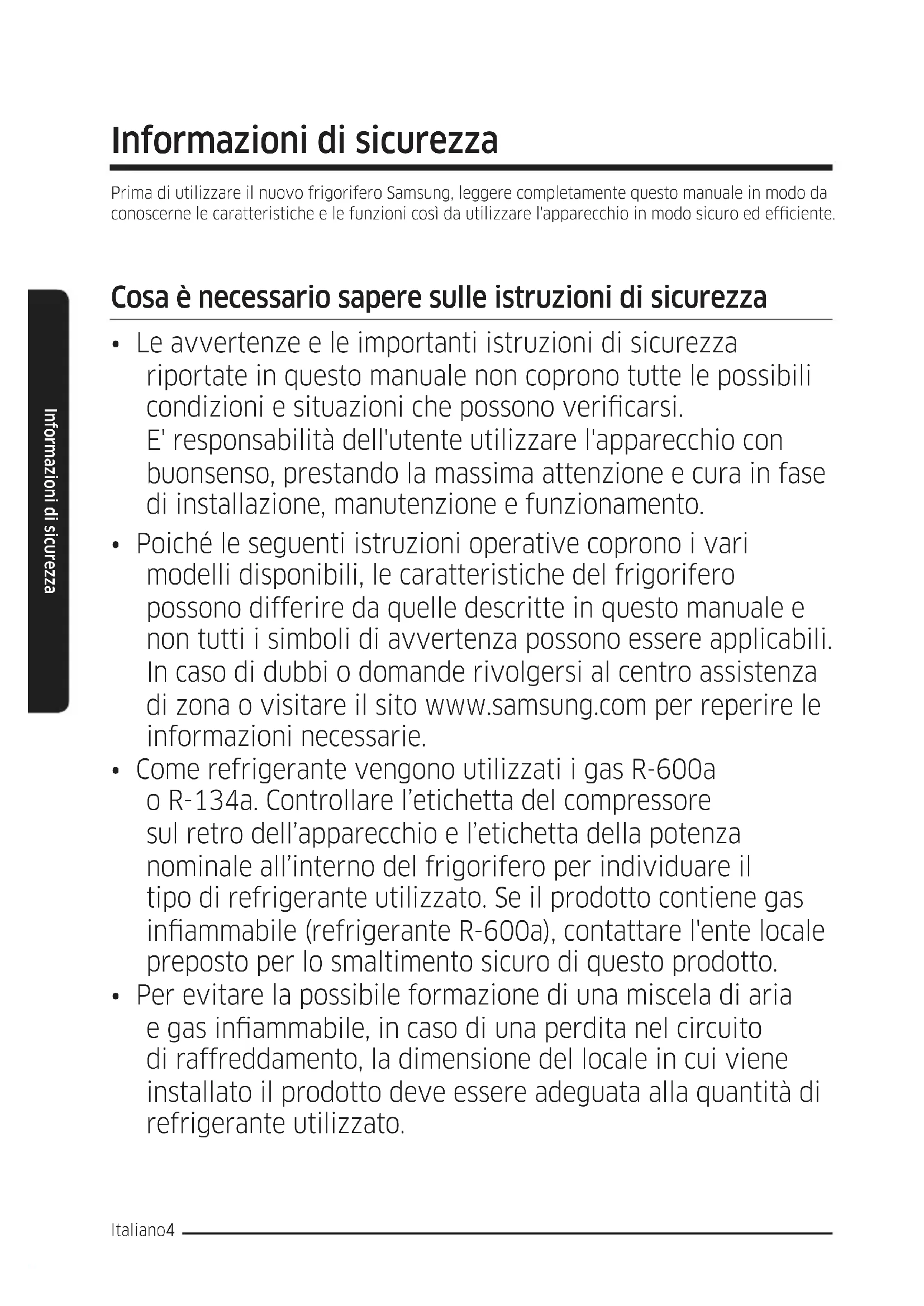 - Poiché le seguenti istruzioni operative coprono i vari modelli disponibili, le caratteristiche del frigorifero possono differire da quelle descritte in questo manuale e non tutti i simboli di avvertenza possono essere applicabili. In caso di dubbi o domande rivolgersi al centro assistenza di zona o visitare il sito www.samsung.com per reperire le informazioni necessarie.