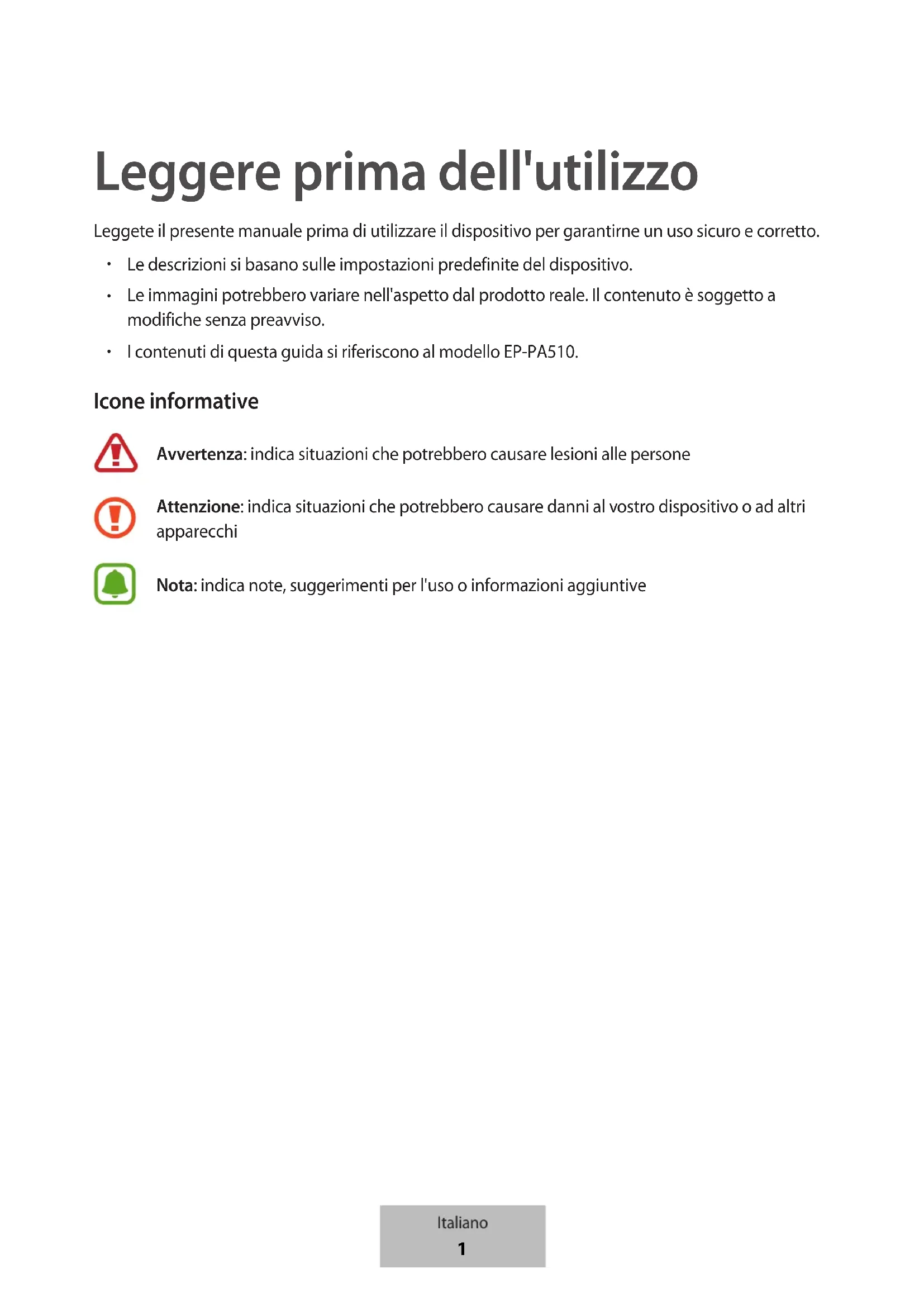 I contenuti di questa guida si riferiscono al modello EP-PA510. Icone informative Avvertenza: indica situazioni che potrebbero causare lesioni alle persone Attenzione: indica situazioni che potrebbero causare danni al vostro dispositivo o ad altri apparecchi Nota: indica note, suggerimenti per l'uso o informazioni aggiuntive Italiano