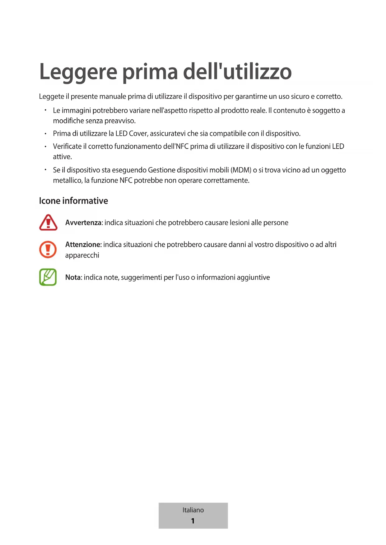 Se il dispositivo sta eseguendo Gestione dispositivi mobili (MDM) o si trova vicino ad un oggetto metallico, la funzione NFC potrebbe non operare correttamente. Icone informative Avvertenza: indica situazioni che potrebbero causare lesioni alle persone Attenzione: indica situazioni che potrebbero causare danni al vostro dispositivo o ad altri apparecchi Nota: indica note, suggerimenti per l'uso o informazioni aggiuntive Italiano
