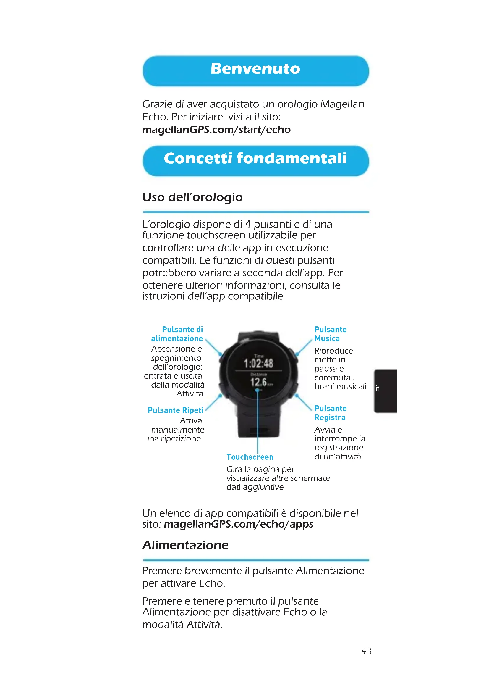 Benvenuto Grazie di aver acquistato un orologio Magellan Echo. Per iniziare, visita il sito: magellanGPS.com/start/echo Concetti fondamentali Uso dell’orologio L’orologio dispone di 4 pulsanti e di una funzione touchscreen utilizzabile per controllare una delle app in esecuzione compatibili. Le funzioni di questi pulsanti potrebbero variare a seconda dell’app. Per ottenere ulteriori informazioni, consulta le istruzioni dell’app compatibile. Pulsante Registra Avvia e interrompe la registrazione di un’attività Pulsante Musica Riproduce, mette in pausa e commuta i brani musicali Pulsante di alimentazione Accensione e spegnimento dell’orologio; entrata e uscita dalla modalità Attività Pulsante Ripeti Attiva manualmente una ripetizione Touchscreen Gira la pagina per visualizzare altre schermate dati aggiuntive Un elenco di app compatibili è disponibile nel sito: magellanGPS.com/echo/apps Alimentazione Premere brevemente il pulsante Alimentazione per attivare Echo. Premere e tenere premuto il pulsante Alimentazione per disattivare Echo o la modalità Attività.44