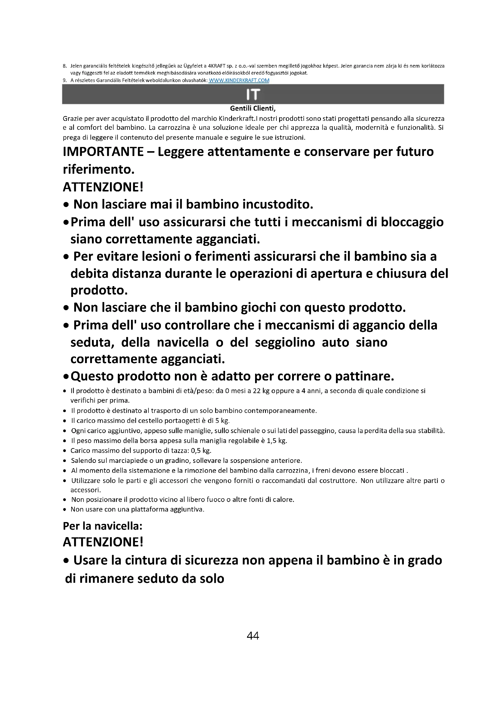 Gentili Clienti, Grazie per aver acquistato il prodotto del marchio Kinderkraft.I nostri prodotti sono stati progettati pensando alla sicurezza e al comfort del bambino. La carrozzina è una soluzione ideale per chi apprezza la qualità, modernità e funzionalità. Si prega di leggere il contenuto del presente manuale e seguire le sue istruzioni. IMPORTANTE – Leggere attentamente e conservare per futuro riferimento. ATTENZIONE!