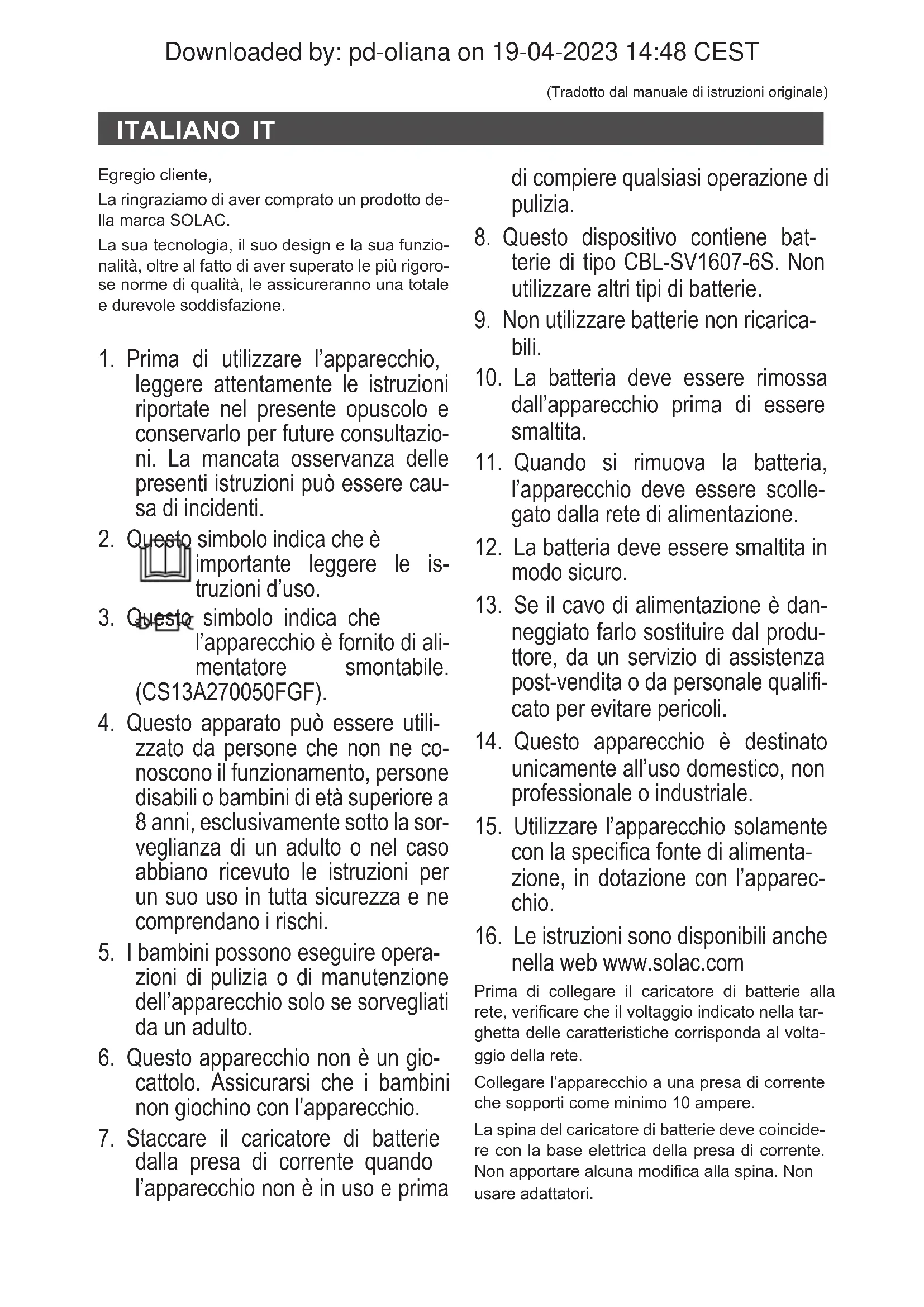 nella web www.solac.com Prima di collegare il caricatore di batterie alla rete, vericare che il voltaggio indicato nella tar- ghetta delle caratteristiche corrisponda al volta- ggio della rete. Collegare l’apparecchio a una presa di corrente che sopporti come minimo 10 ampere. La spina del caricatore di batterie deve coincide- re con la base elettrica della presa di corrente. Non apportare alcuna modica alla spina. Non usare adattatori. Downloaded by: pd-oliana on 19-04-2023 14:48 CESTIT (Tradotto dal manuale di istruzioni originale) Non tirare il cavo elettrico. Non usarlo mai per sollevare, trasportare o scollegare il caricatore di batterie. Non avvolgere il cavo di alimentazione attorno all’apparecchio. Non lasciare che il cavo rimanga impigliato o attorcigliato. Controllare lo stato del cavo di alimentazione: I cavi danneggiati o attorcigliati aumentano il ris- chio di scariche elettriche. Non toccare mai la spina con le mani bagnate. Non utilizzare l’apparecchio nel caso in cui il cavo di alimentazione o la spina siano danne- ggiati. In caso di rottura di una parte dell’involucro es- terno dell’apparecchio, scollegare immediata- mente la spina dalla presa di corrente al ne di evitare eventuali scariche elettriche. Non usare l’apparecchio in seguito a cadute, nel caso presenti danni visibili o in presenza di qual- siasi perdita. Evitare qualsiasi contatto con il liquido che può fuoriuscire dalla batteria. In caso di contatto ac- cidentale con gli occhi, rivolgersi a un medico. Il liquido che fuoriesce dalla batteria può provoca- re irritazioni o ustioni. SERVIZIO Il produttore invalida la garanzia e declina ogni responsabilità in caso di uso inappropriato de- ll’apparecchio o non conforme alle istruzioni d’uso.