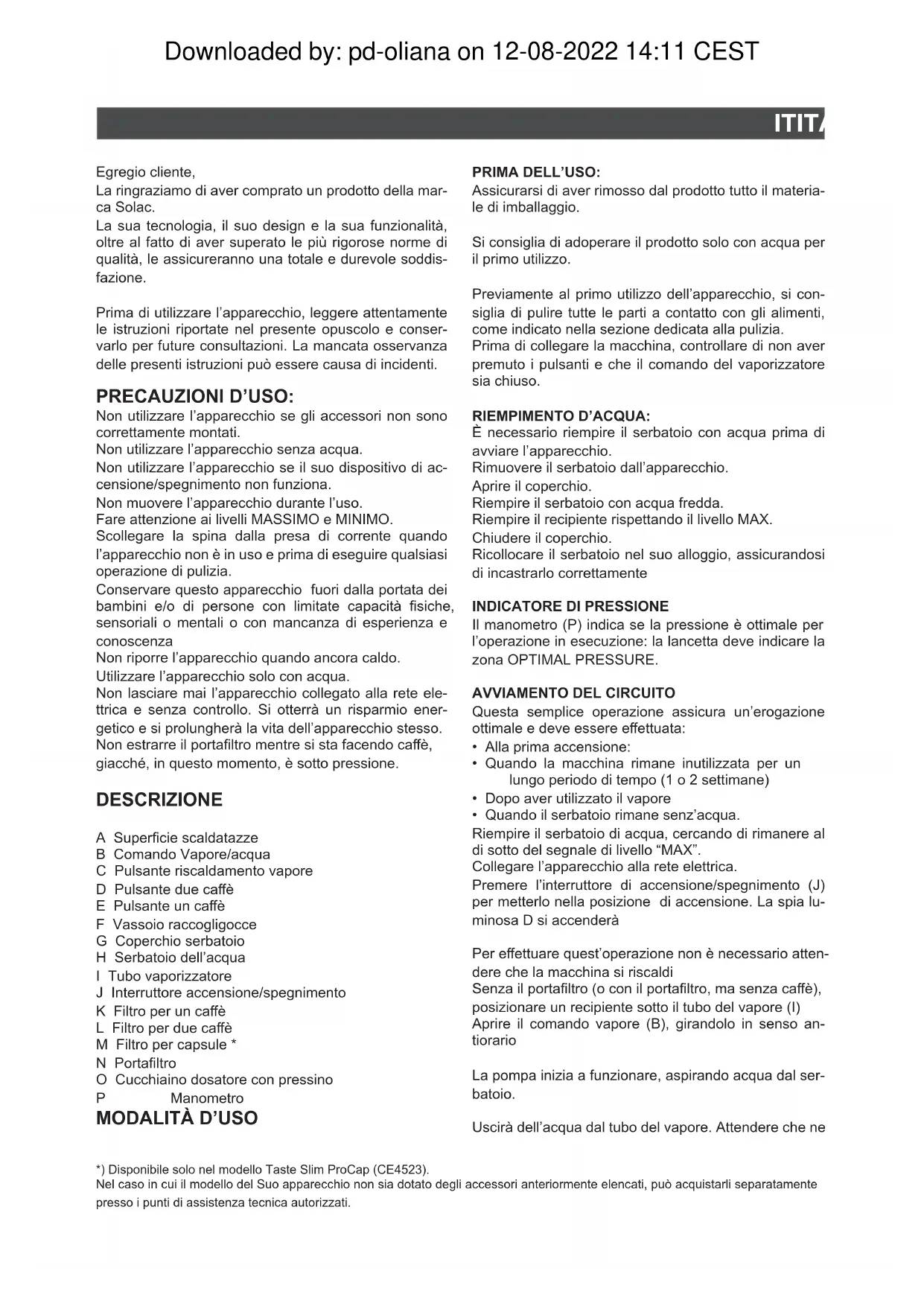 *) Disponibile solo nel modello Taste Slim ProCap (CE4523). Nel caso in cui il modello del Suo apparecchio non sia dotato degli accessori anteriormente elencati, può acquistarli separatamente presso i punti di assistenza tecnica autorizzati. Egregio cliente, La ringraziamo di aver comprato un prodotto della mar- ca Solac. La sua tecnologia, il suo design e la sua funzionalità, oltre al fatto di aver superato le più rigorose norme di qualità, le assicureranno una totale e durevole soddis- fazione. Prima di utilizzare l’apparecchio, leggere attentamente le istruzioni riportate nel presente opuscolo e conser- varlo per future consultazioni. La mancata osservanza delle presenti istruzioni può essere causa di incidenti. PRIMA DELL’USO: Assicurarsi di aver rimosso dal prodotto tutto il materia- le di imballaggio. Si consiglia di adoperare il prodotto solo con acqua per il primo utilizzo. Previamente al primo utilizzo dell’apparecchio, si con- siglia di pulire tutte le parti a contatto con gli alimenti, come indicato nella sezione dedicata alla pulizia. Prima di collegare la macchina, controllare di non aver premuto i pulsanti e che il comando del vaporizzatore sia chiuso. RIEMPIMENTO D’ACQUA: È necessario riempire il serbatoio con acqua prima di avviare l’apparecchio. Rimuovere il serbatoio dall’apparecchio. Aprire il coperchio. Riempire il serbatoio con acqua fredda. Riempire il recipiente rispettando il livello MAX. Chiudere il coperchio. Ricollocare il serbatoio nel suo alloggio, assicurandosi di incastrarlo correttamente