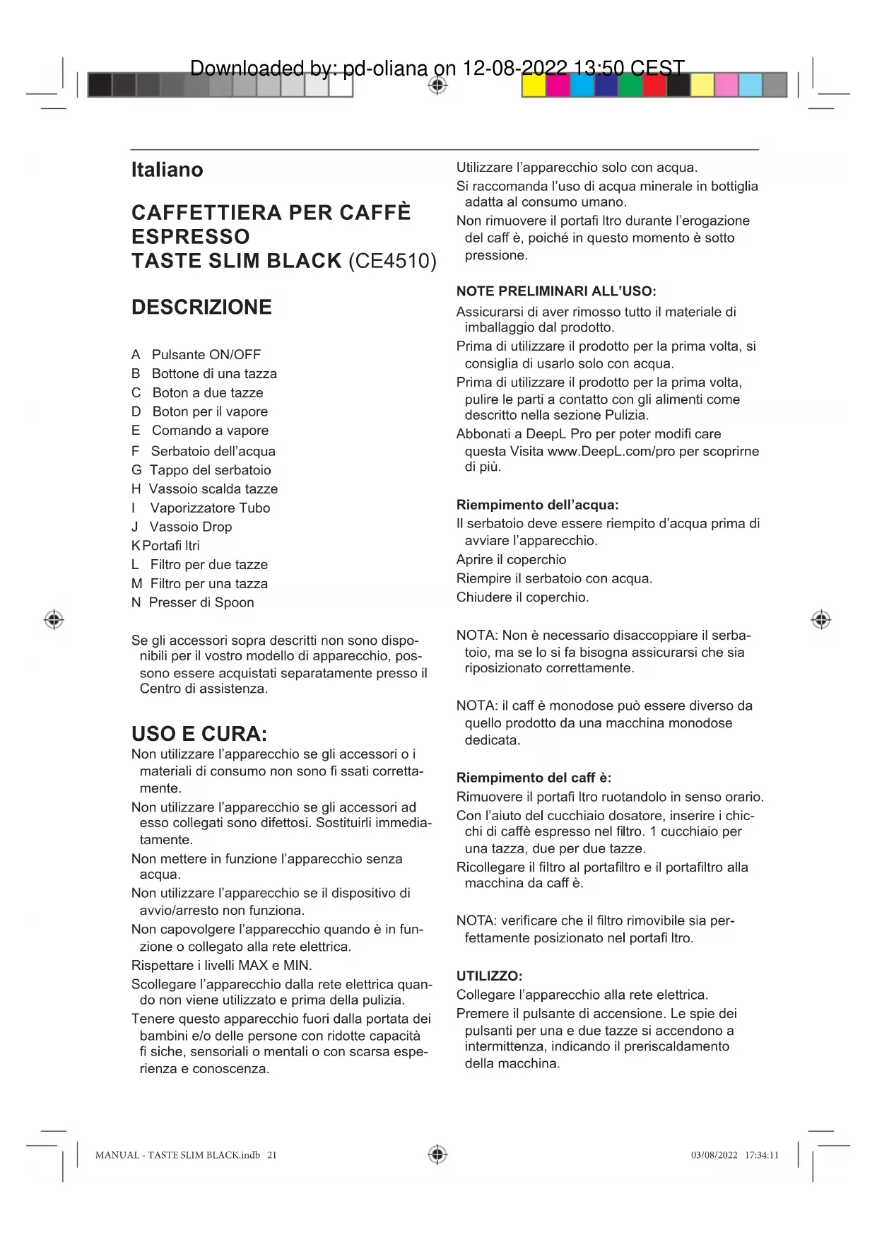 ESPRESSO TASTE SLIM BLACK (CE4510) DESCRIZIONE A Pulsante ON/OFF B Bottone di una tazza C Boton a due tazze D Boton per il vapore E Comando a vapore F Serbatoio dell’acqua G Tappo del serbatoio H Vassoio scalda tazze I Vaporizzatore Tubo J Vassoio Drop K Portafi ltri L Filtro per due tazze M Filtro per una tazza N Presser di Spoon Se gli accessori sopra descritti non sono dispo- nibili per il vostro modello di apparecchio, pos- sono essere acquistati separatamente presso il Centro di assistenza. USO E CURA: Non utilizzare l’apparecchio se gli accessori o i materiali di consumo non sono fi ssati corretta- mente. Non utilizzare l’apparecchio se gli accessori ad esso collegati sono difettosi. Sostituirli immedia- tamente. Non mettere in funzione l’apparecchio senza acqua. Non utilizzare l’apparecchio se il dispositivo di avvio/arresto non funziona. Non capovolgere l’apparecchio quando è in fun- zione o collegato alla rete elettrica. Rispettare i livelli MAX e MIN. Scollegare l’apparecchio dalla rete elettrica quan- do non viene utilizzato e prima della pulizia. Tenere questo apparecchio fuori dalla portata dei bambini e/o delle persone con ridotte capacità fi siche, sensoriali o mentali o con scarsa espe- rienza e conoscenza. Utilizzare l’apparecchio solo con acqua. Si raccomanda l’uso di acqua minerale in bottiglia adatta al consumo umano. Non rimuovere il portafi ltro durante l’erogazione del caff è, poiché in questo momento è sotto pressione. NOTE PRELIMINARI ALL’USO: Assicurarsi di aver rimosso tutto il materiale di imballaggio dal prodotto. Prima di utilizzare il prodotto per la prima volta, si consiglia di usarlo solo con acqua. Prima di utilizzare il prodotto per la prima volta, pulire le parti a contatto con gli alimenti come descritto nella sezione Pulizia. Abbonati a DeepL Pro per poter modifi care questa Visita www.DeepL.com/pro per scoprirne di più. Riempimento dell’acqua: Il serbatoio deve essere riempito d’acqua prima di avviare l’apparecchio. Aprire il coperchio Riempire il serbatoio con acqua. Chiudere il coperchio. NOTA: Non è necessario disaccoppiare il serba- toio, ma se lo si fa bisogna assicurarsi che sia riposizionato correttamente. NOTA: il caff è monodose può essere diverso da quello prodotto da una macchina monodose dedicata. Riempimento del caff è: Rimuovere il portafi ltro ruotandolo in senso orario. Con l’aiuto del cucchiaio dosatore, inserire i chic- chi di caff è espresso nel fi ltro. 1 cucchiaio per una tazza, due per due tazze. Ricollegare il fi ltro al portafi ltro e il portafi ltro alla macchina da caff è. NOTA: verifi care che il fi ltro rimovibile sia per- fettamente posizionato nel portafi ltro. UTILIZZO: Collegare l’apparecchio alla rete elettrica. Premere il pulsante di accensione. Le spie dei pulsanti per una e due tazze si accendono a intermittenza, indicando il preriscaldamento della macchina. MANUAL - TASTE SLIM BLACK.indb 21MANUAL - TASTE SLIM BLACK.indb 21 03/08/2022 17:34:1103/08/2022 17:34:11 Downloaded by: pd-oliana on 12-08-2022 13:50 CESTQuando smettono di lampeggiare, l’infusore entra in stato di riscaldamento ed è pronto a prepara- re il caff è preferito. Preparare il caff è Seguire le istruzioni per il riempimento del caff è con il fi ltro da una tazza/una dose. Una volta fi ssato il portafi ltro alla macchina con il caff è, premere il pulsante per un caff è. La macchina si arresta automaticamente al termi- ne dell’estrazione. Preparare due caff è Seguire le istruzioni per il riempimento del caff è con il fi ltro a due tazze. Una volta che il portafi ltro è attaccato alla macchi- na con il caff è, premere il pulsante di erogazio- ne di due caff è. La macchina si arresta automaticamente al termi- ne dell’estrazione. Preparare il caff è in cialde Seguire la procedura di riempimento del caff è con il fi ltro da una tazza/singola dose, sostituendo il misurino con il fi ltro monodose. Una volta fi ssato il portafi ltro alla macchina con il caff è, premere il pulsante per un caff è. La macchina si arresta automaticamente al termi- ne dell’estrazione. Acqua calda Dalla posizione riscaldata, posizionare un bicchie- re sotto il vaporizzatore. Aprire il passaggio vapore/acqua calda con la manopola di regolazione del vapore. L’acqua calda inizierà a fuoriuscire. Per fi nire, chiudere il fl usso dell’acqua con il comando del vapore. Schiumare il latte Dalla posizione di riscaldamento, premere il pul- sante del vapore. Inizierà a lampeggiare. Quando smette di lampeggiare, la macchina è pronta a erogare vapore secco. Collocare un contenitore di latte sotto l’ugello e inserirlo fi nché l’uscita del vapore non tocca quasi il fondo del contenitore. Aprire il passaggio vapore/acqua calda con la manopola vapore. Si sentirà il rumore del vapo- re che esce. Regolare la temperatura toccando il contenitore e, quando si ritiene che sia suffi cientemente strutturato o caldo, chiudere la manopola della vaporiera. NOTA: una volta prodotto il vapore, se si desidera tornare all’estrazione del caff è, premere il pulsante per uno o due caff è e rilasciare la pres- sione seguendo la procedura ACQUA CALDA di questo manuale. Rilasciando un po’ d’acqua, la temperatura si abbassa e la pressione si allenta.