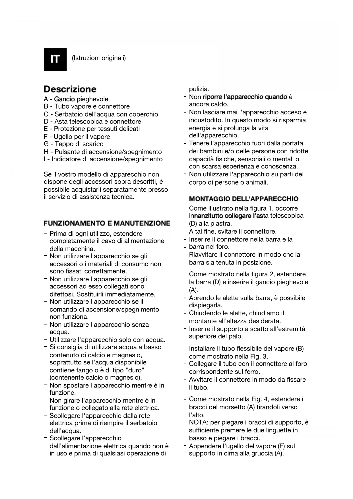 Não sai vapor e há um ruído no tubo. As gotículas de água acumulam-se na mangueira de vapor. Endireitar a mangueira de vapor para que o vapor flua correctamente. O vapor sai de forma intermitente. Há incrustações calcárias. Utilizar água com baixo teor de cálcio ou magnésio. Resolução de problemasIT (Istruzioni originali) Descrizione A - Gancio pieghevole B - Tubo vapore e connettore C - Serbatoio dell'acqua con coperchio D - Asta telescopica e connettore E - Protezione per tessuti delicati F - Ugello per il vapore G - Tappo di scarico H - Pulsante di accensione/spegnimento I - Indicatore di accensione/spegnimento Se il vostro modello di apparecchio non dispone degli accessori sopra descritti, è possibile acquistarli separatamente presso il servizio di assistenza tecnica.