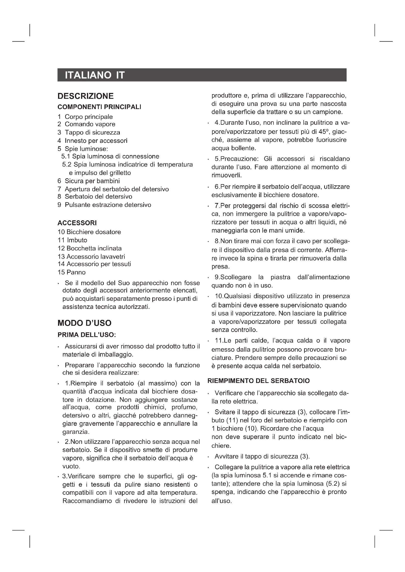 - Collegare la pulitrice a vapore alla rete elettrica (la spia luminosa 5.1 si accende e rimane cos- tante); attendere che la spia luminosa (5.2) si spenga, indicando che l’apparecchio è pronto all’uso.IT